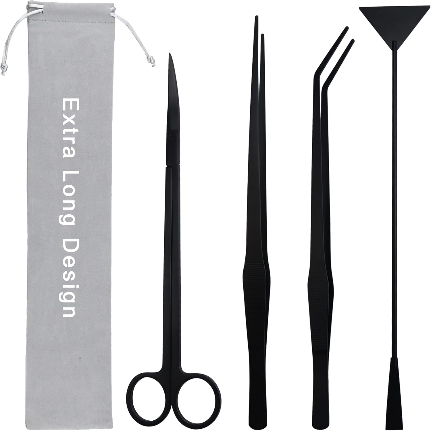 - What You Get: Come with black aquarium tank aquascape tools kits included 1 x 15.3" sand spatula, 1 x 15" straight tweezers, 1 x 15" curved tweezers, 1 x 12" curved scissors and 1 x storage plush pouch, one set to make your aquascaping life easier.
