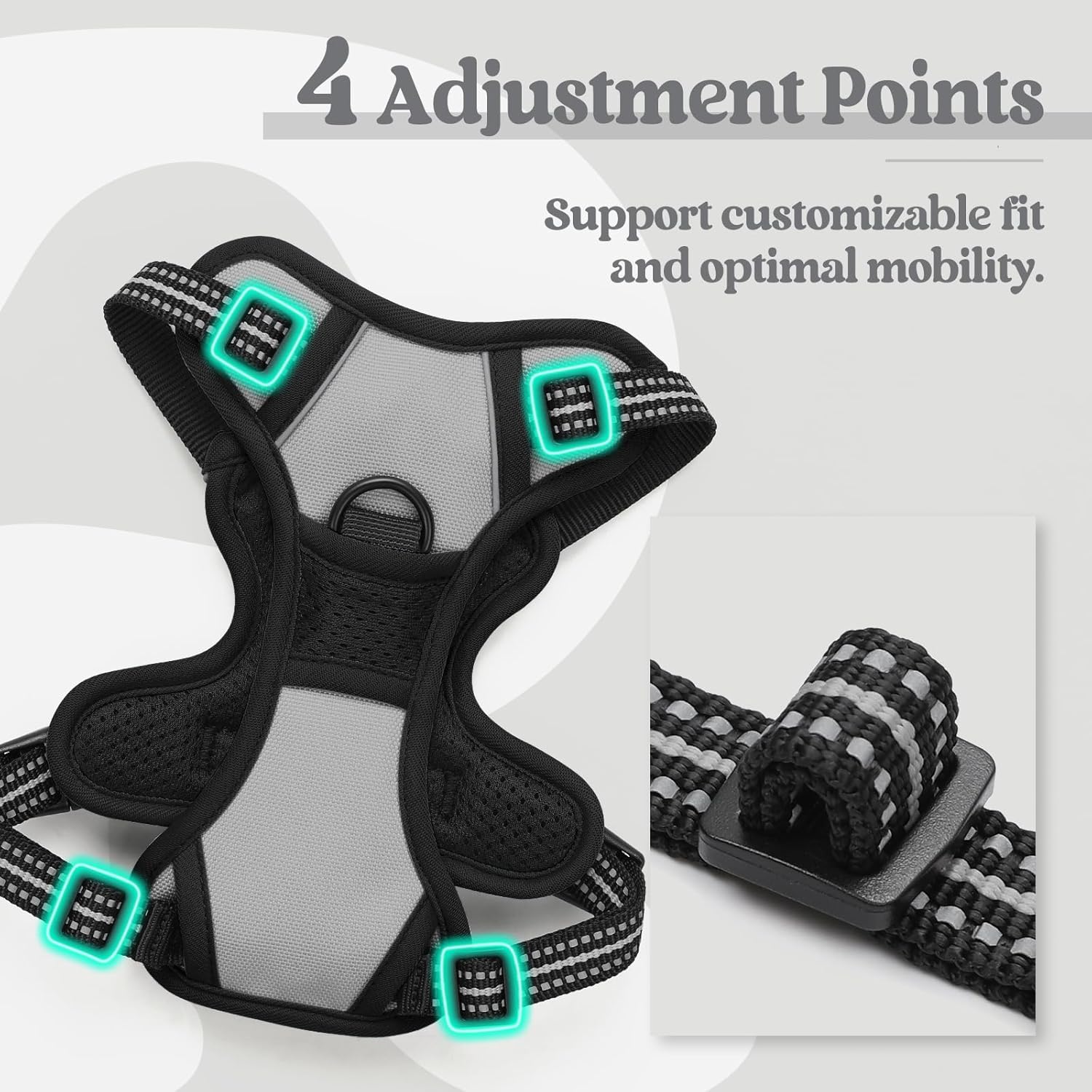 - Fully Adjustable - This adjustable harness features 4 easy adjusting straps around the body. You can use its 2 neck straps and 2 chest straps to create a perfect fit for your dog with some room of growth. No worries about slipping out or choking