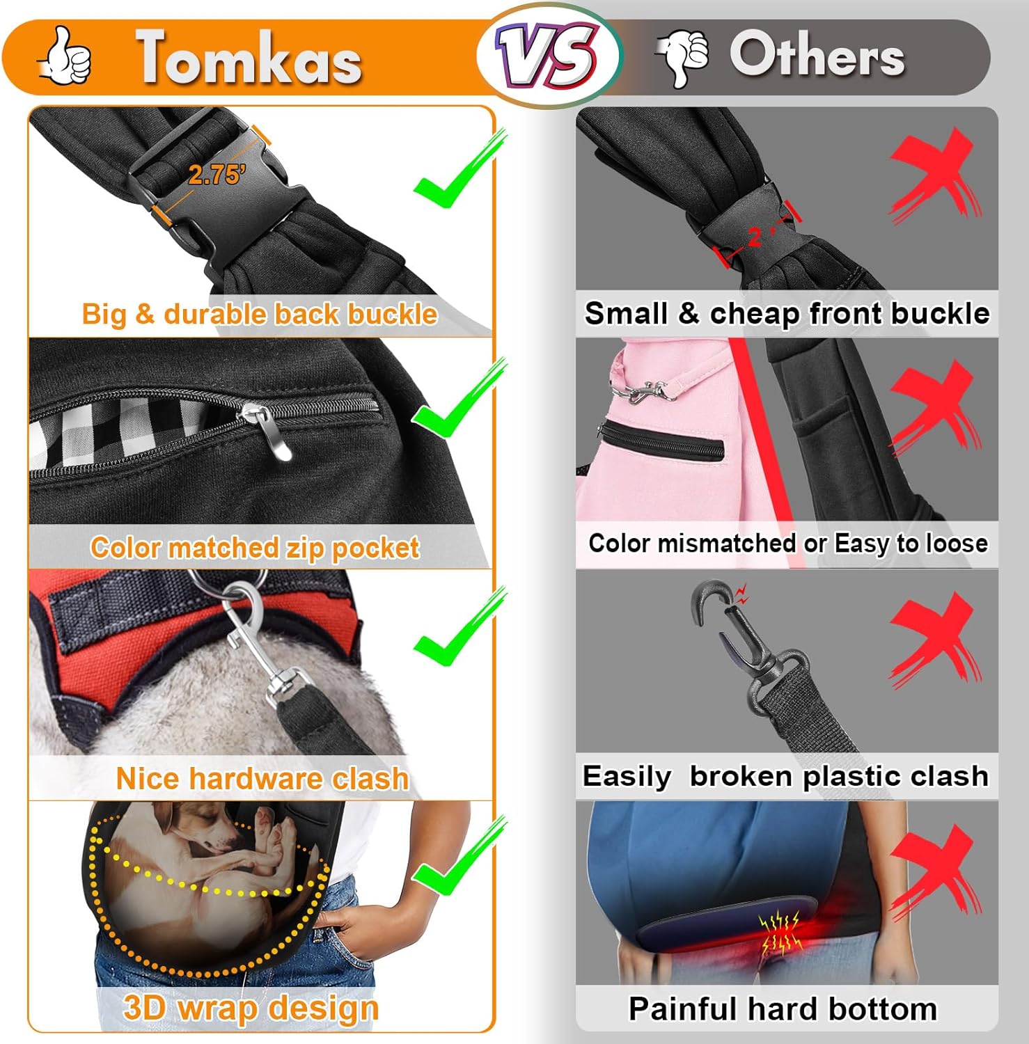 - Sufficient Safety: pets can be easily put into TOMKAS small dog carrier sling after a brief acclimation. You just put your dog in it, attach the safety buckle to the leash buckle on the vest or harness. If your pet wants to jump out of the pouch, the safety belt will stop it from this dangerous behavior and keep your puppy safe. TOMKAS small dog sling is very reliable in terms of safety.Remember, never tie the safety buckle to the collar, it could hurt the dog's neck if it jumps out.