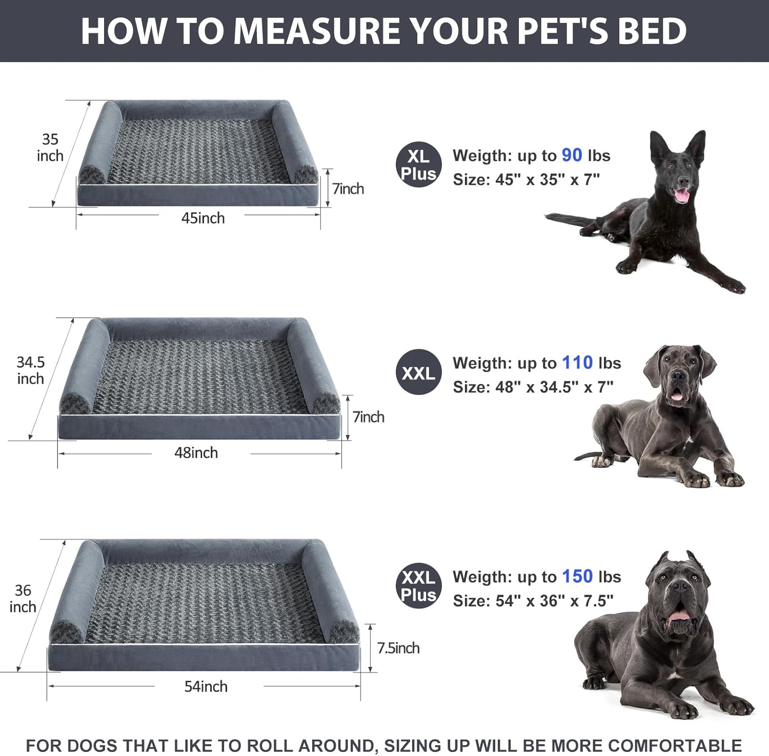 • DIMENSIONS (DOG BEDS FOR MEDIUM DOGS): jumber plus dog bed 54" x 36" x 7" (3.5" bolstered side ) for medium and large dogs up to 150 lbs. For dogs that like to roll around, sizing up will be more comfortable.