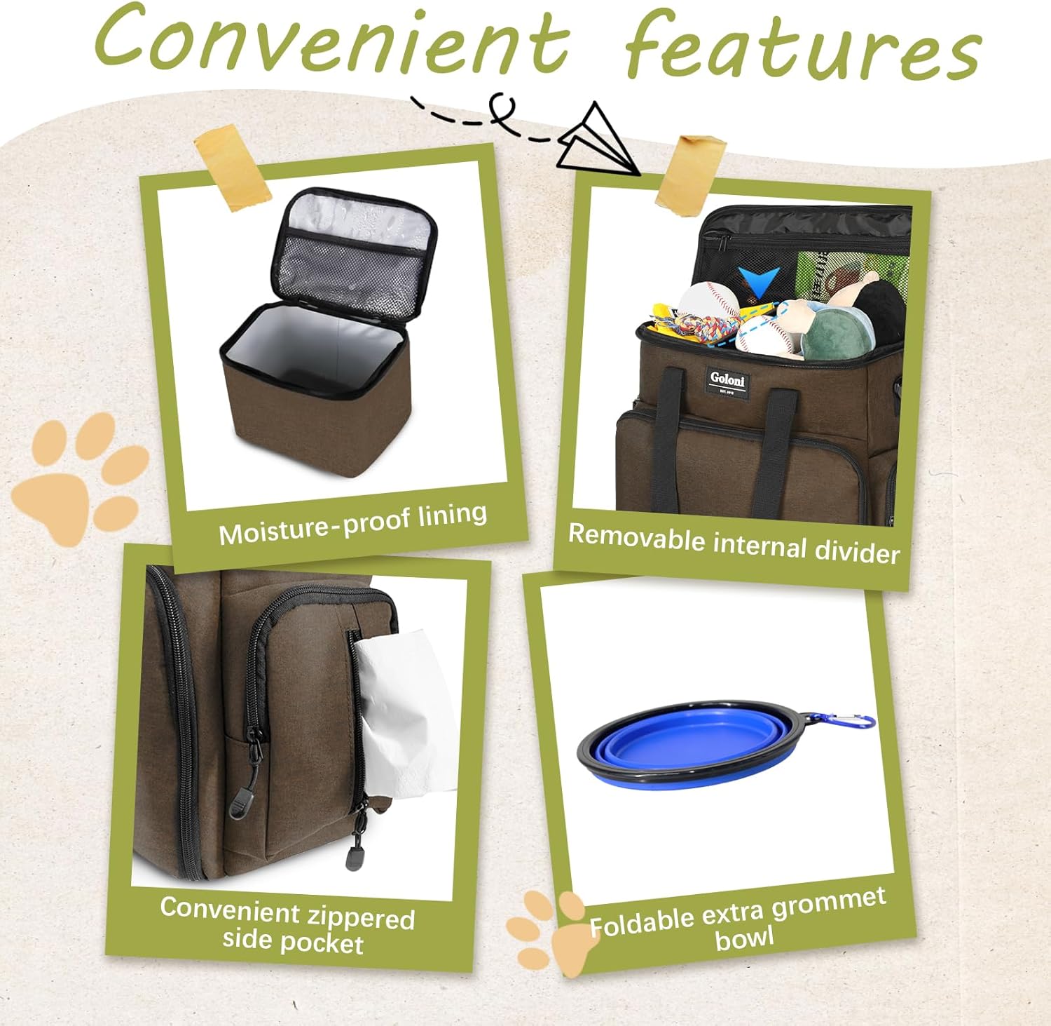 - Smart Storage & Organization – Features multiple pockets, an adjustable flap, and a spacious main compartment to hold food, treats, toys, leashes, and pet essentials—keeping everything neatly in place