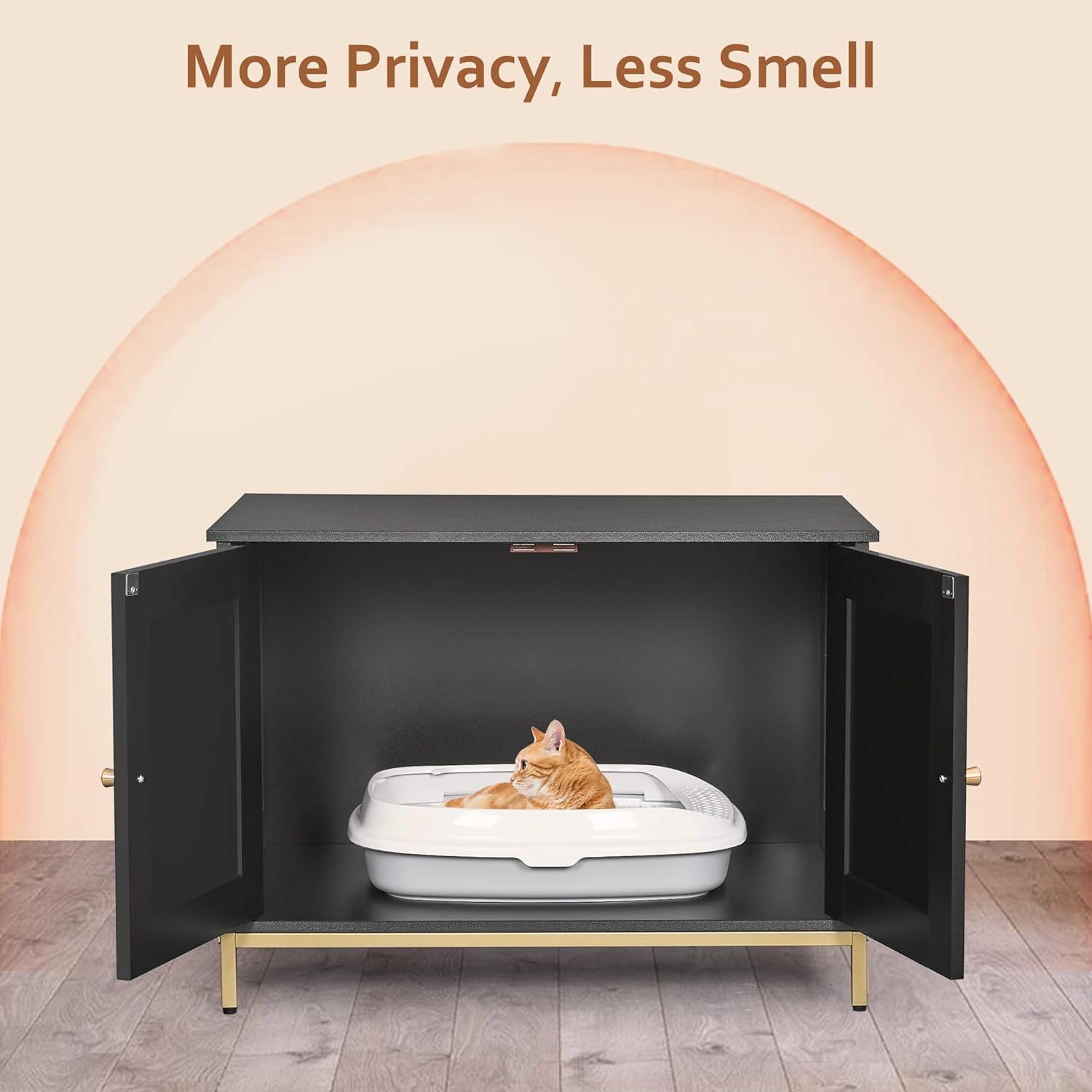 - Modern style: The cat litter box cabinet features black finish and metallic gold-colored metal frame, adding an elegant and stylish touch to your home decor. Its minimalist design and exquisite detailing inject a touch of luxury and sophistication into your living space