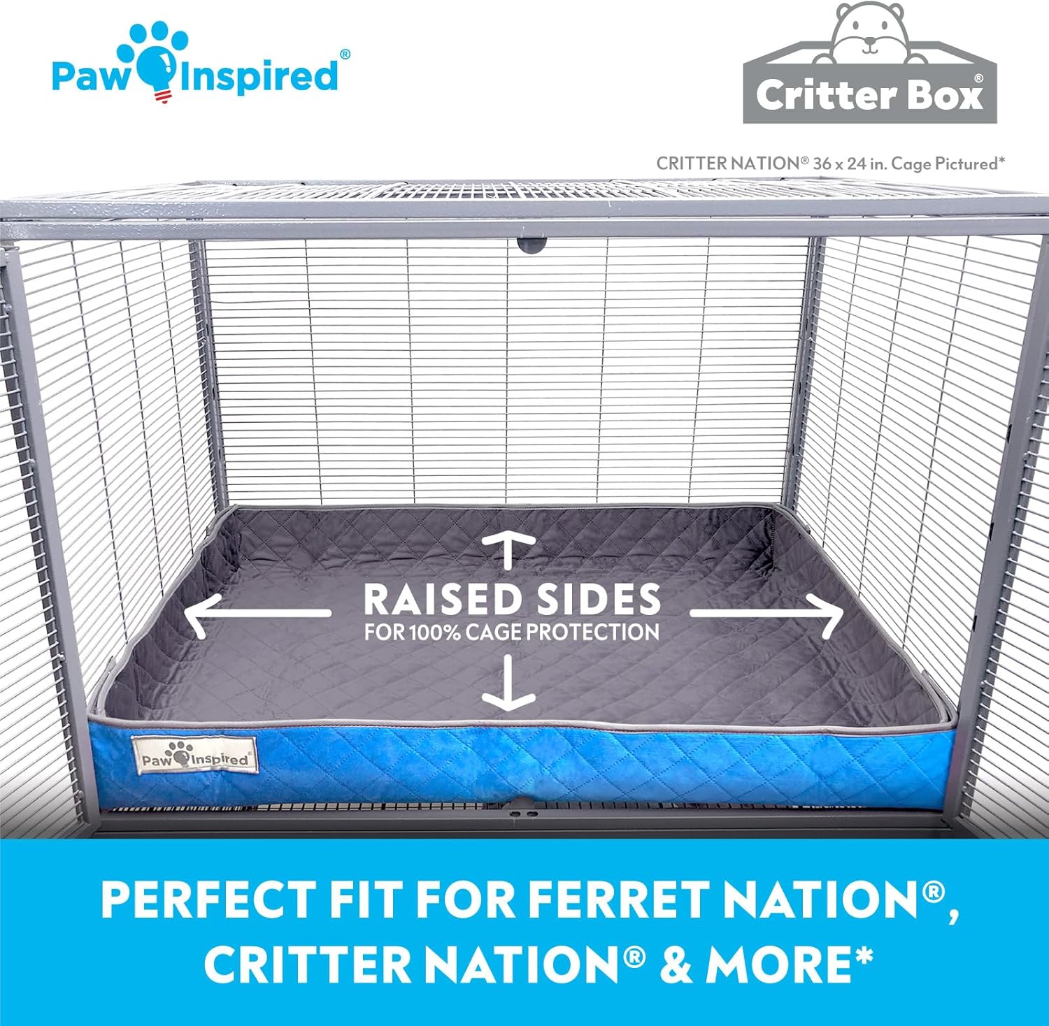 Paw Inspired Critter Box Washable Cage Liner, Reversible Fleece Bedding with Raised Sides for Ferrets, Guinea Pigs, Rats, Chinchillas, and Other Small Animals (Critter Nation/Ferret Nation, Gray/Blue)