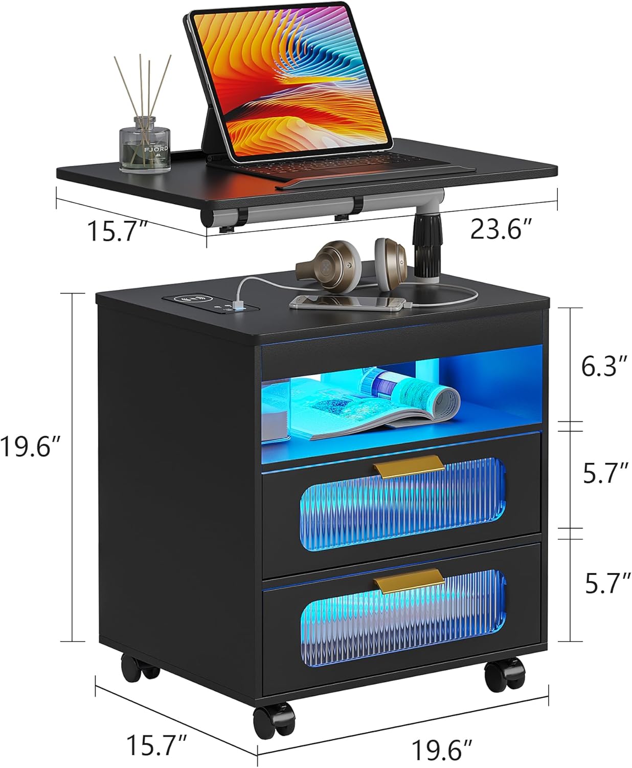 HNEBC Nightstand with Wireless Charging Station, LED Nightstand Has Adjustable Rotary Workstation,Smart Night Stand with 2 Drawers,Modern Bedside Table for Bedroom, Sensor Light/Wheel (Black)