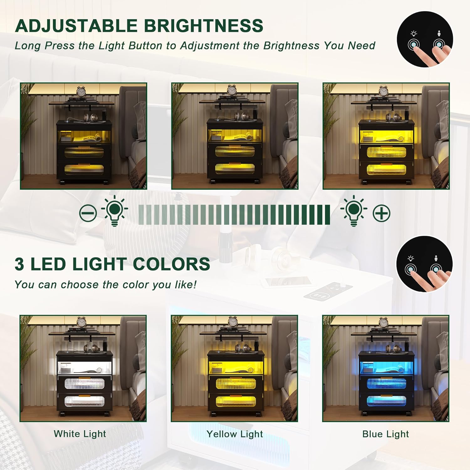 - ✅【Large Capacity Space】 The led nightstand provides spacious storage for nighttime essentials. There is a swivel desk; Open storage shelves; 2 drawers,The desktop can hold everyday items and keep them within reach.