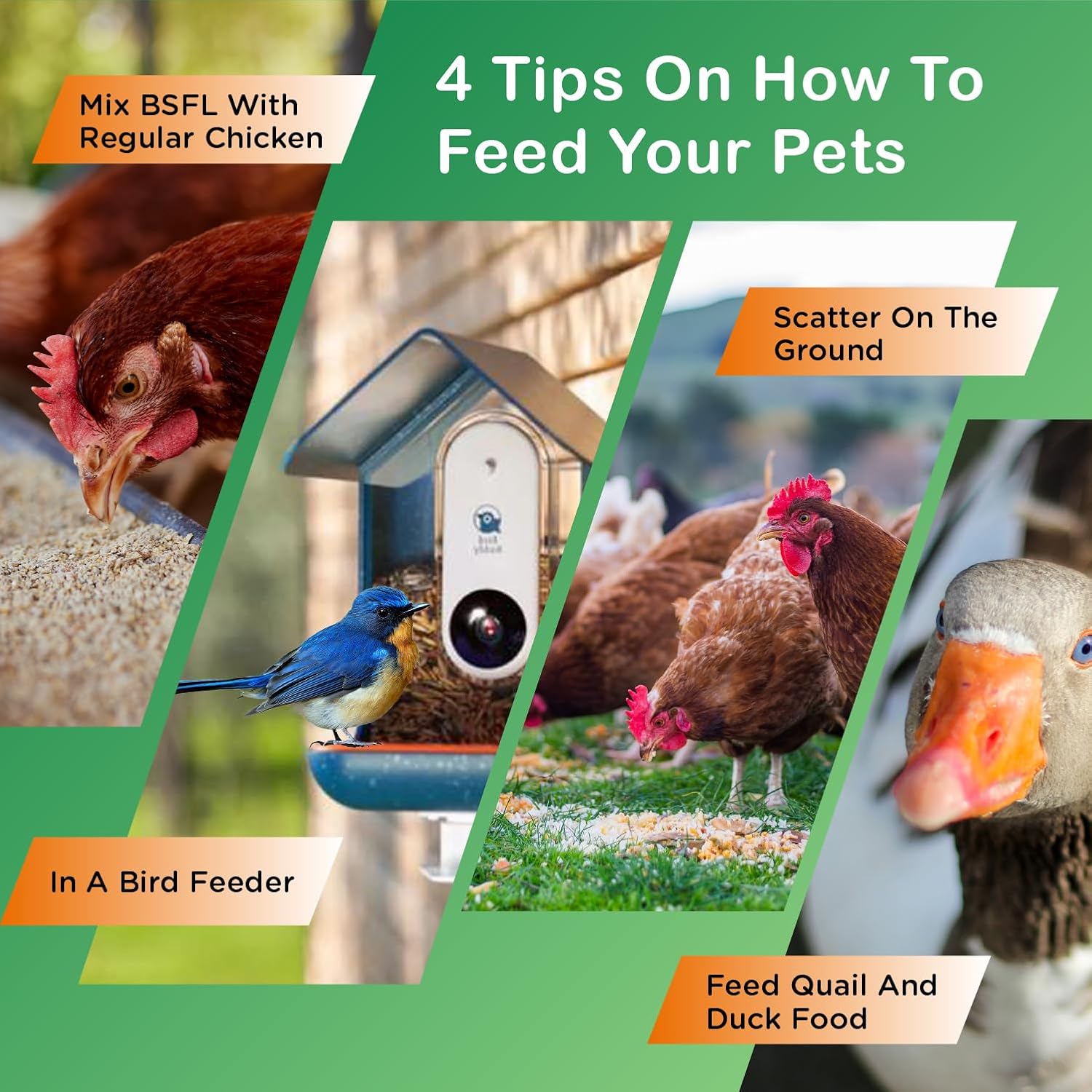 - Rich in Calcium & Essential Nutrients – Black soldier fly larvae are naturally rich in calcium, essential amino acids, and minerals such as phosphorus and magnesium. These nutrients support healthy feather growth and stronger eggshells, while being lower in fat than many other protein sources
