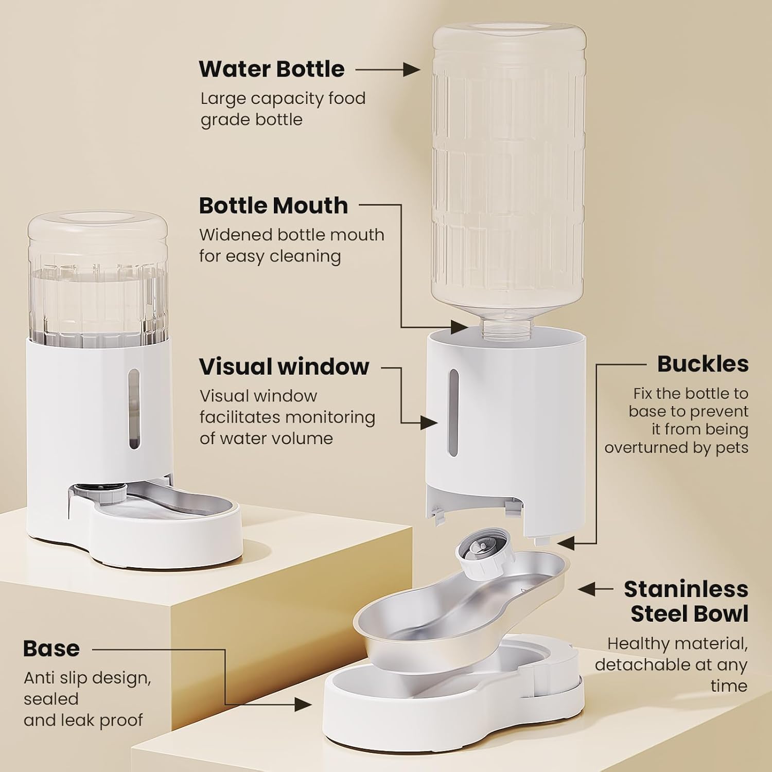 - [Drinking Safe] We take care of pets' drinking water health. The water bowl is fully attached to the base and made of food grade 304 stainless steel. Other components also use pet friendly materials.