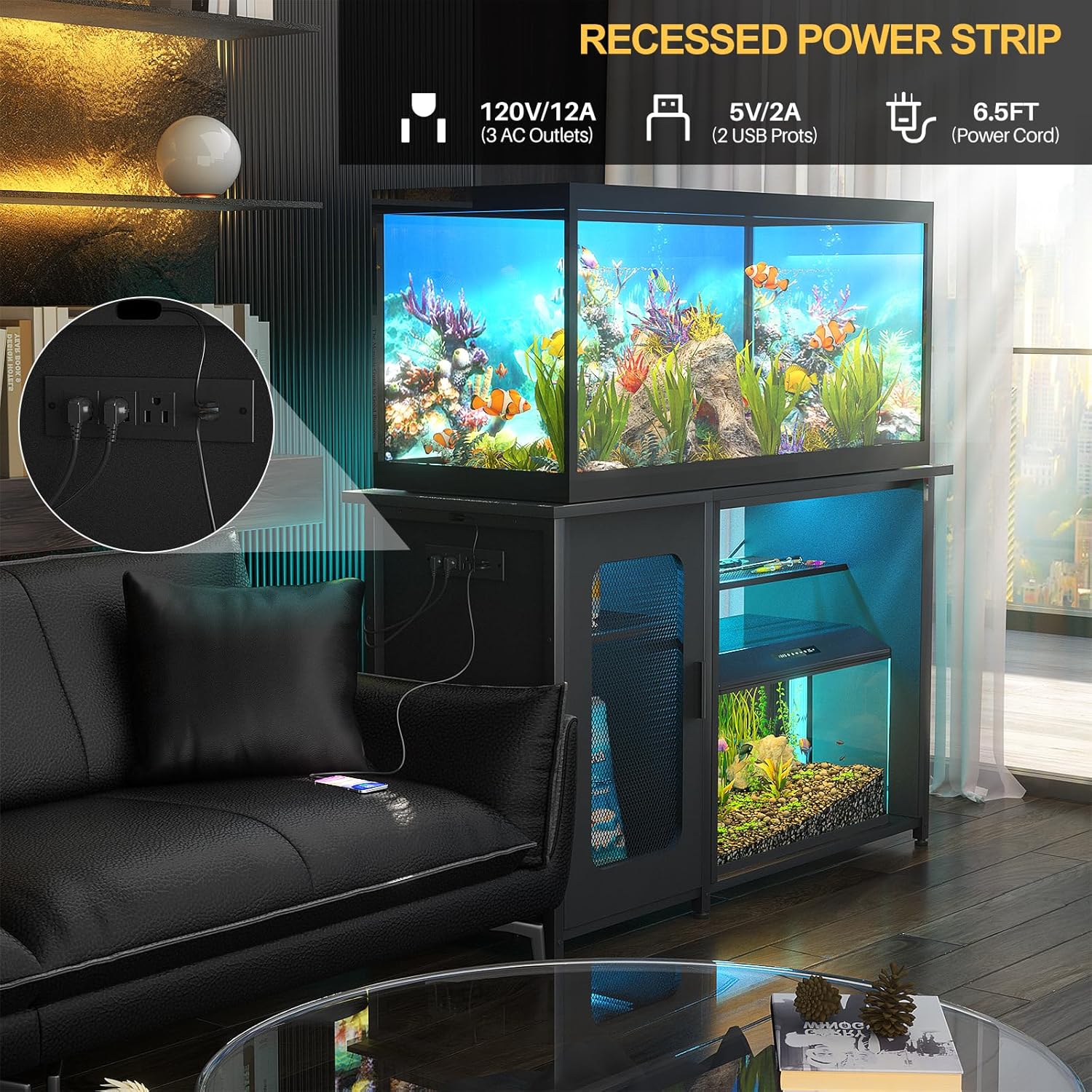 - Magic Power Outlets & USB Charging Ports: The Fish Tank Stand includes a built-in power strip with 3 outlets & 2 USB Ports, which provides convenience for charging heater rods, filters, LED lights, and other devices, avoiding cluttered wires, simplifying your fish tank management.