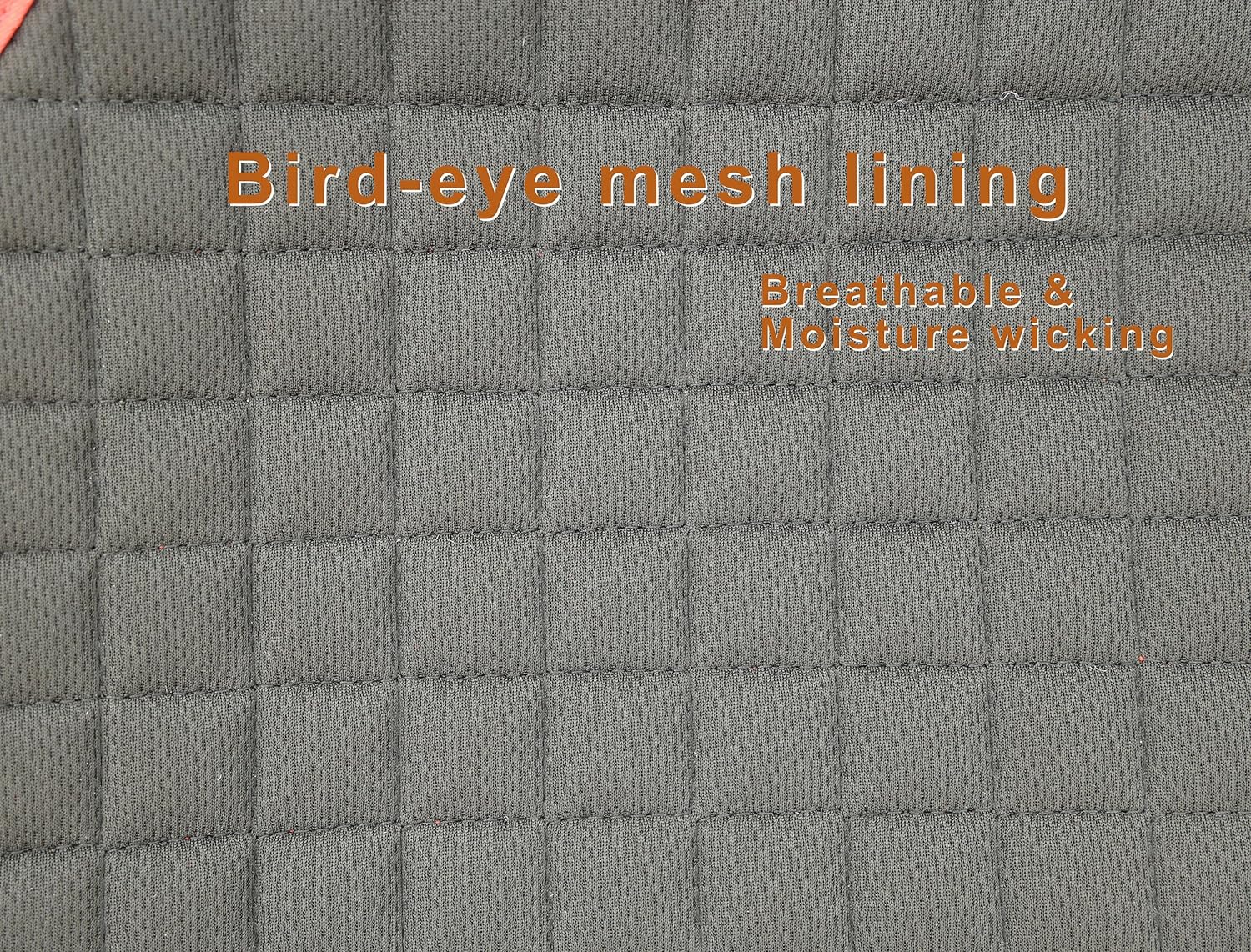 - The bird-eye mesh cloth as lining effectively controls heat and sweat, efficiently wicking away moisture. The pique surface helps keep it from slipping.