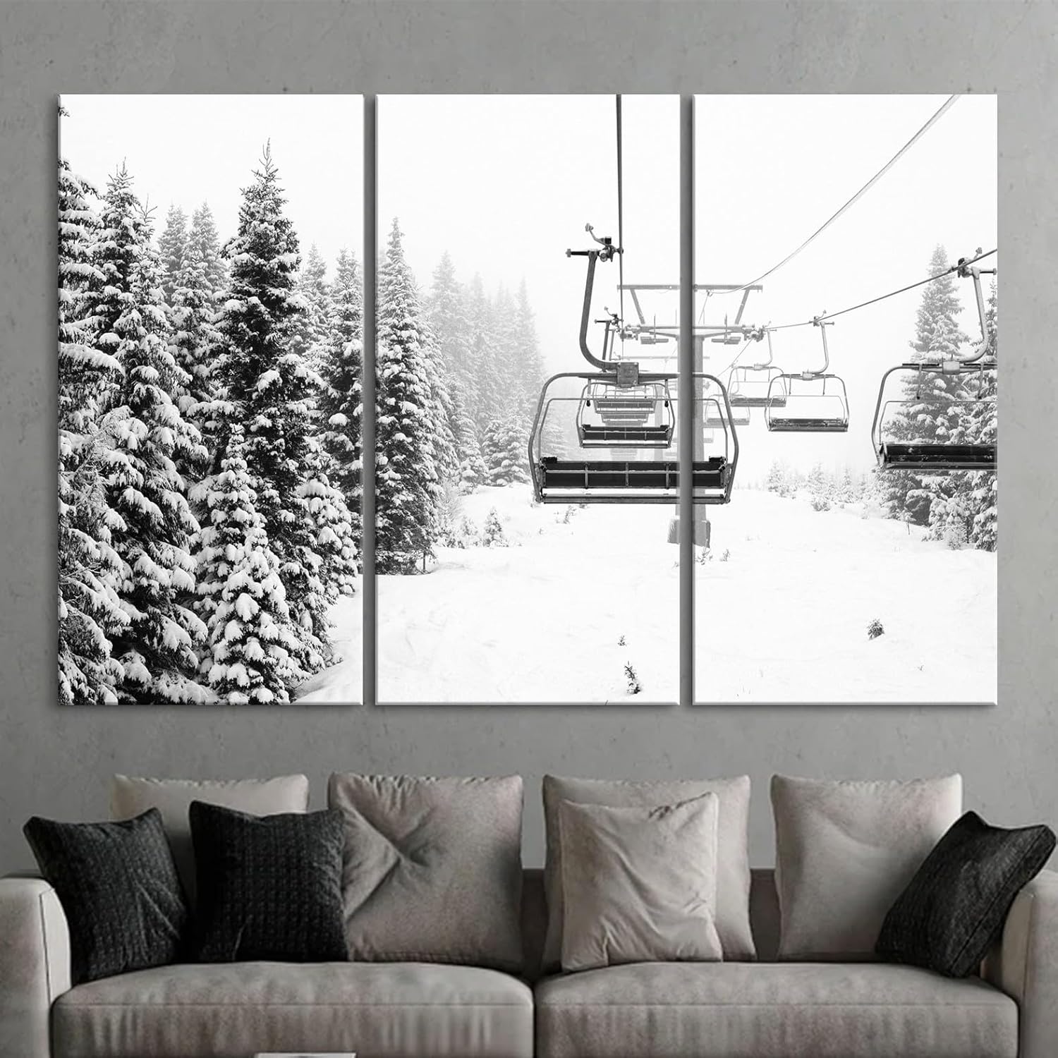 Nature Wall Art Prints - Ocean Forest Mountain Lake Canvas Landscapes - Small to Extra Large Living Room Bedroom Kitchen Bathroom Décor (Ski Lift on Snowy Mountain, 47L" x 71W" - 3 panels)