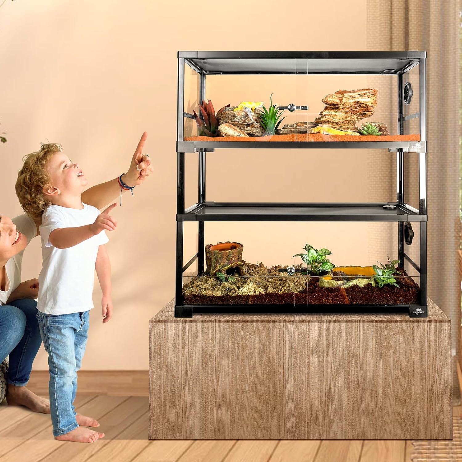 - Double Sliding Door and Cable Pass: CAVACHEW large terrarium design with double sliding door, equipped with upgraded door locks, easy to feed your reptiles and prevent escape, also can save space and no worries about the child opening the tank, cable pass used rotating fixed structure which can holds lines firmly.