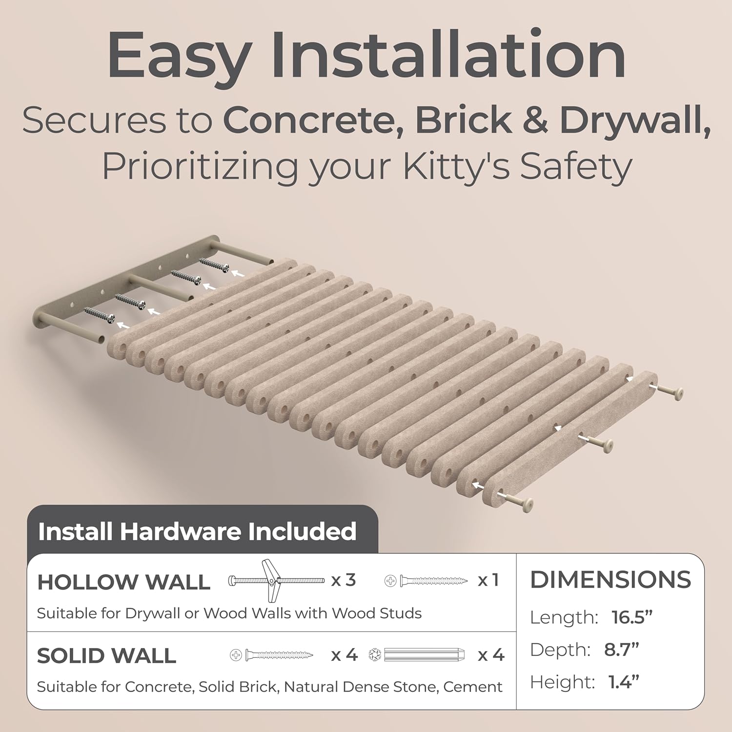 - Effortless Paradise: This cat wall bed includes all hardware, allowing your fur-baby to start exploring right away. Our cat climbing shelf securely attaches to concrete, cement, brick, dry wall and more ensuring your catās safety.