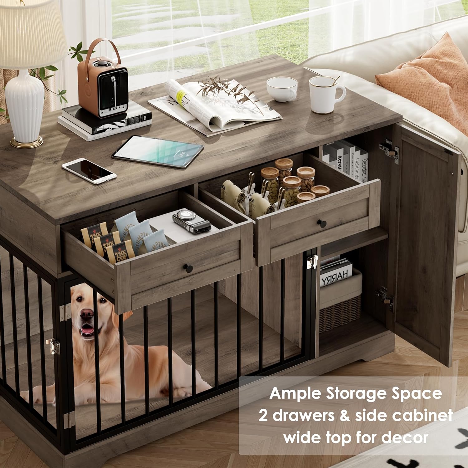 - Dog cage sideboard with storage: 47βX24β massive table top allows to place some decorations. 2 drawers and a spacious cabinet with shelf provide extra storage space for pet items such as dog toys, snacks, food etc. This dog kennel sideboard with drawers is functioning furniture for owners of small and medium-sized dogs, who apart from the comfort of pets, also care about the interior design.