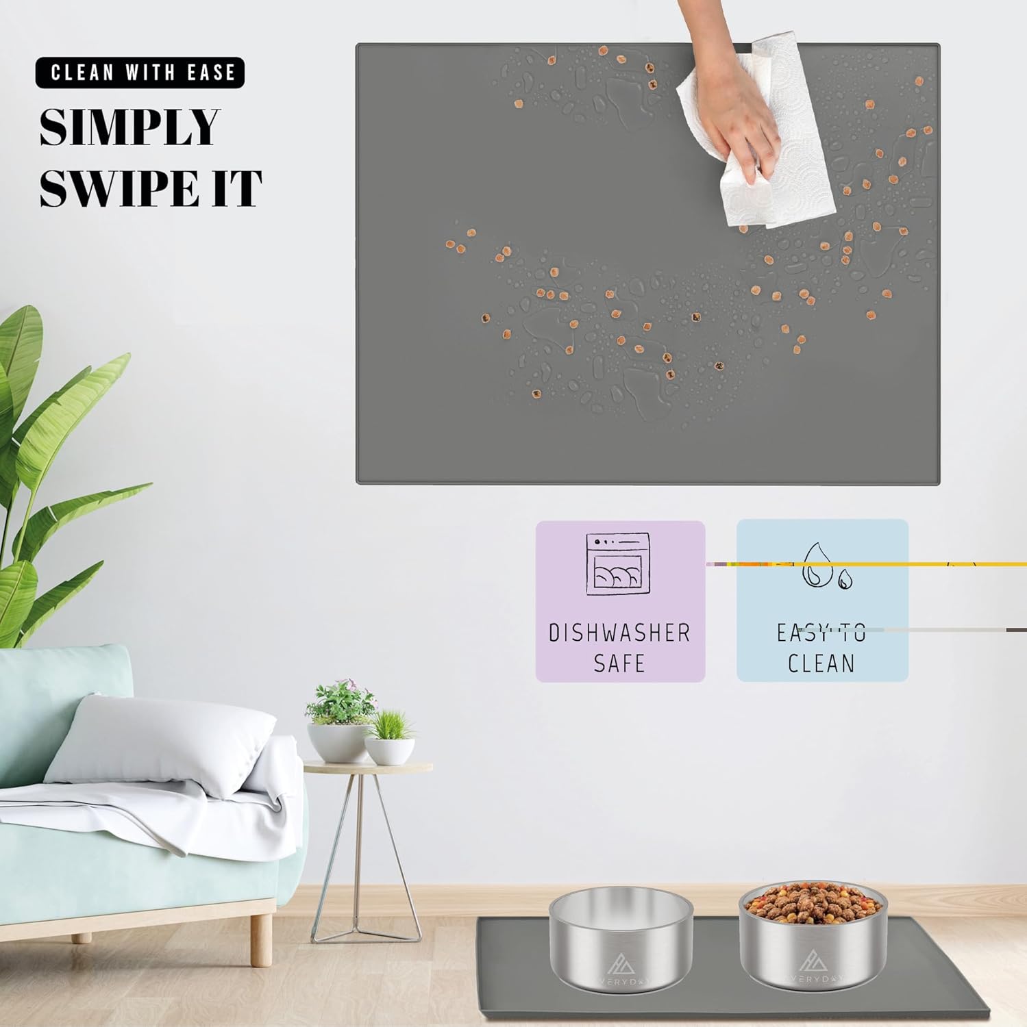 - Non-Slip Design: No more sliding bowls! AVERYDAY's heavy-duty pet mat stop bowls from sliding during meals. The dotted surface boosts slip resistance, ensuring your pets' food and water bowls stay securely in place