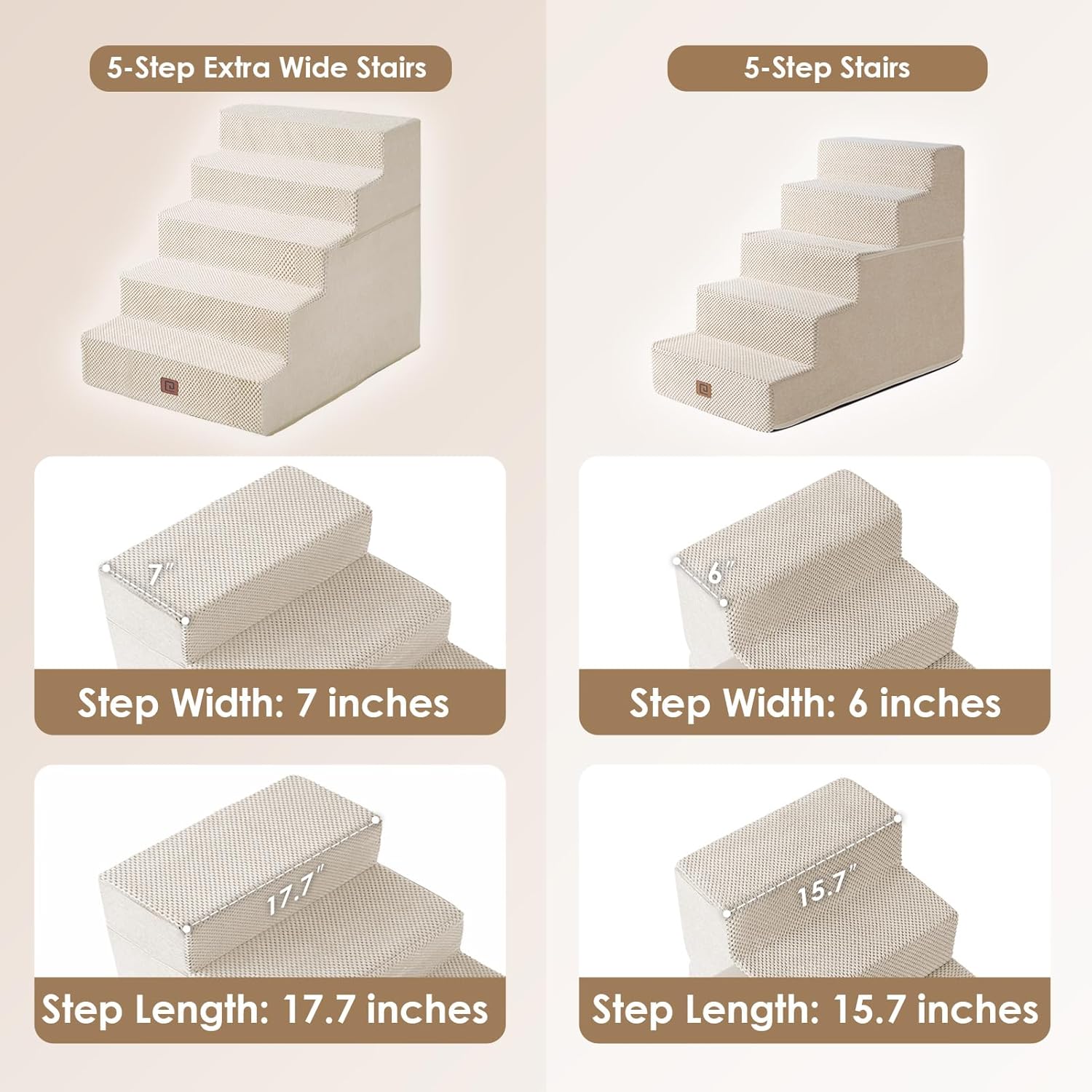 - MULTIPLE STEP SIZES - This dog stair comes in 3, 4, and 5-step options. Our 3-step pet stair is ideal for sofas and low beds (up to 18 inches high), while the 5-step version is better suited for higher beds (up to 27 inches). If your bed is of medium height (up to 23 inches), please select the 4-step one.