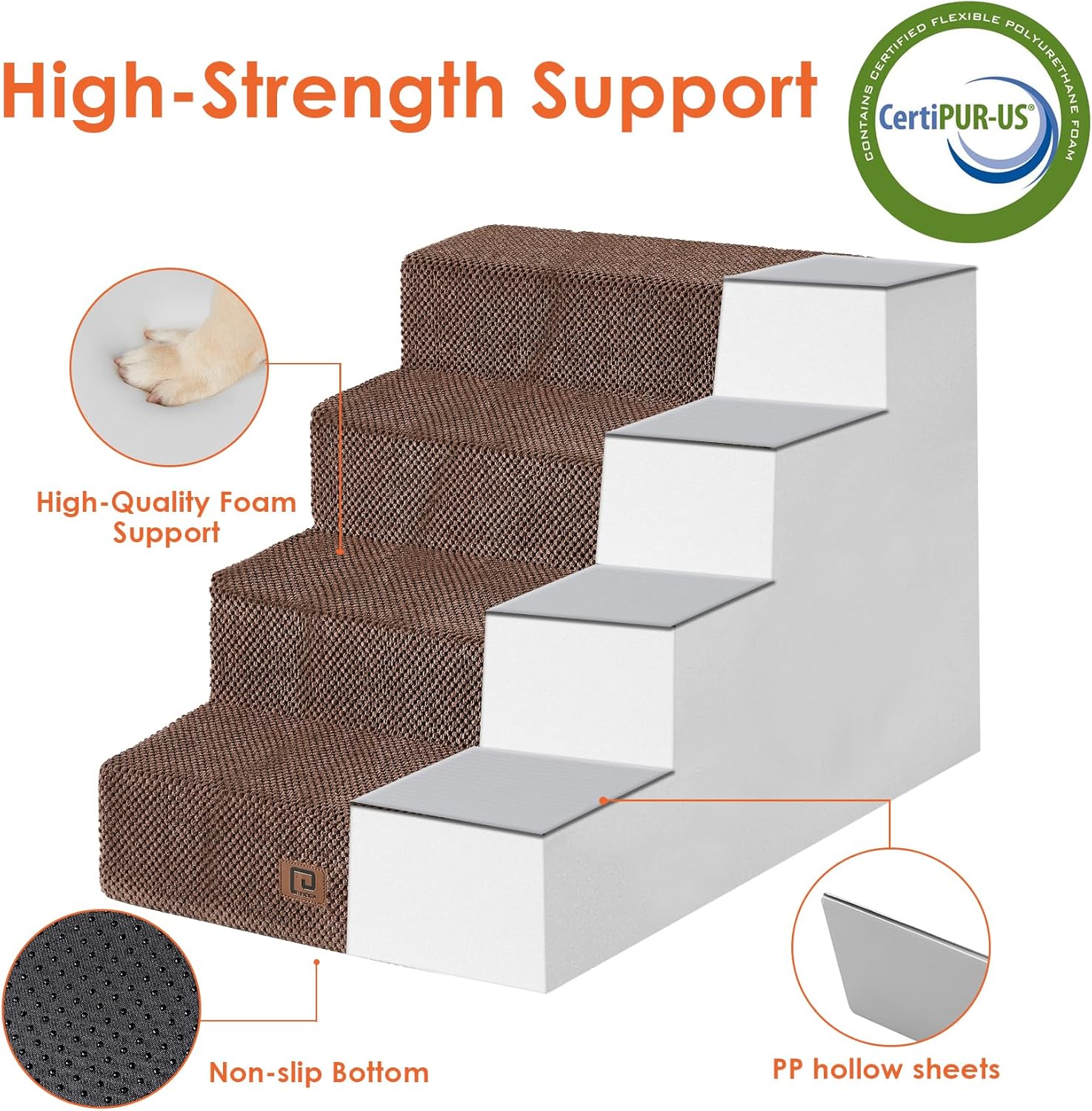 - MULTIPLE STEP SIZES - This dog stair comes in 3, 4, and 5-step options. Our 3-step pet stair is ideal for sofas and low beds (up to 18 inches high), while the 5-step version is better suited for higher beds (up to 27 inches). If your bed is of medium height (up to 23 inches), please select the 4-step one.
