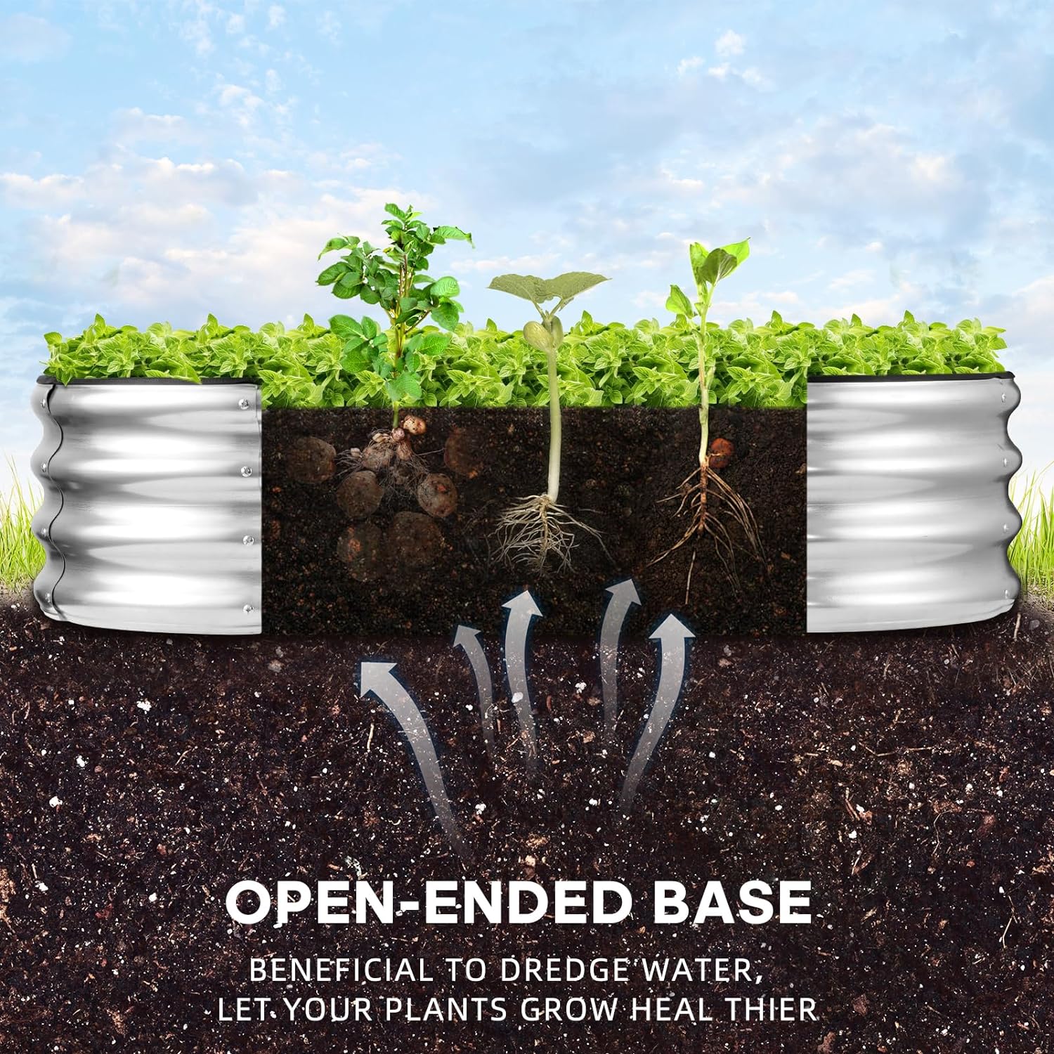 - Open base: This raised garden bed metal galvanized is designed with an open base, Sits on the ground garden bed which can effectively avoid water accumulation .