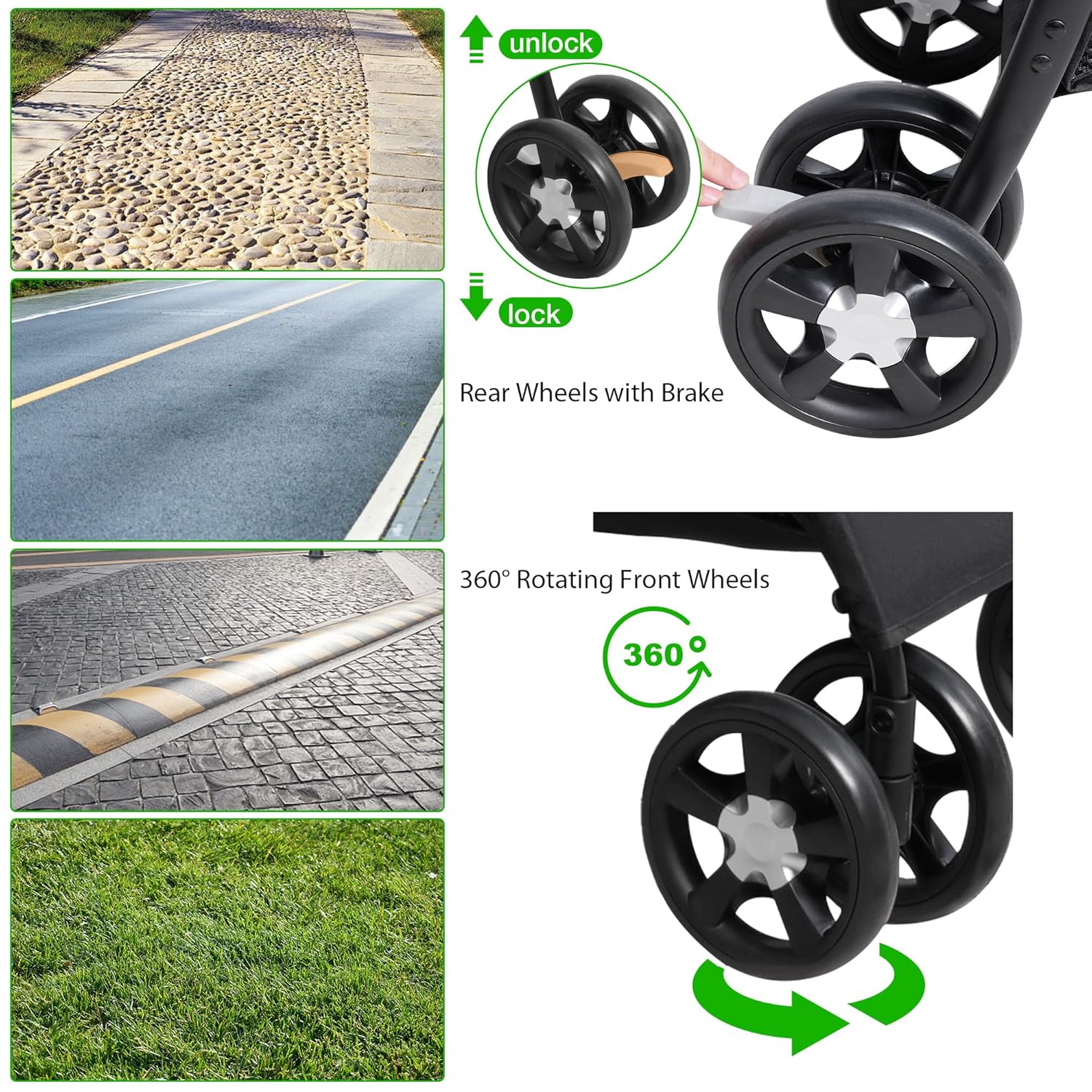 - - Smooth & Safe: Our stroller's 360° swivel front wheels and rear wheels with brakes provide unbeatable control and stability. The built-in seat belt keeps your pet secure, preventing any accidental falls and escapes.