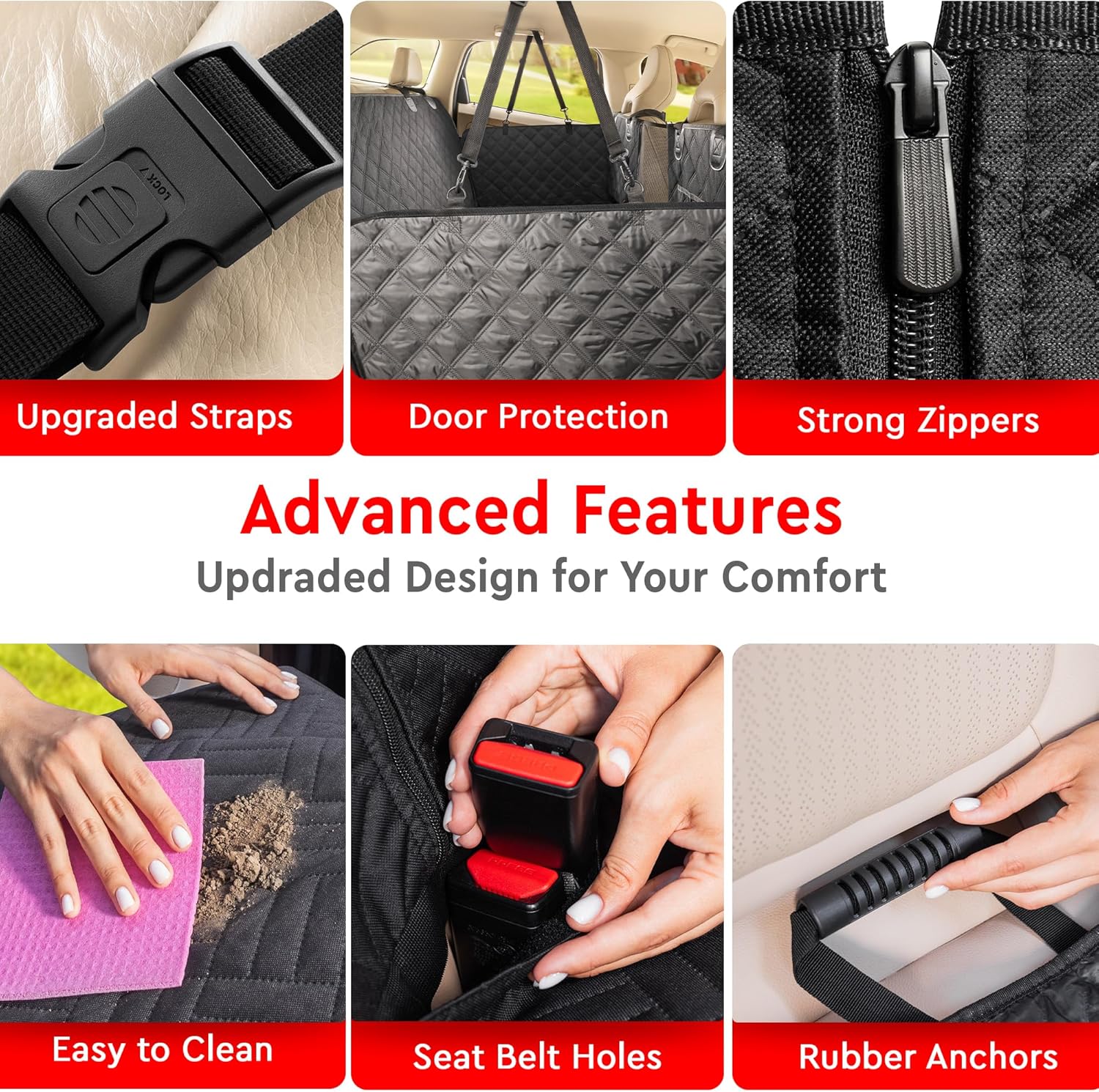 - Upgraded Design β Features a durable net between front seats, 2 storage pockets, and easy access for seat belt buckles. Enhanced straps, buckles, and zippers offer added reliability. Non-slip backing and rubber hangers keep the seat cover secure. Includes a storage bag for convenience.