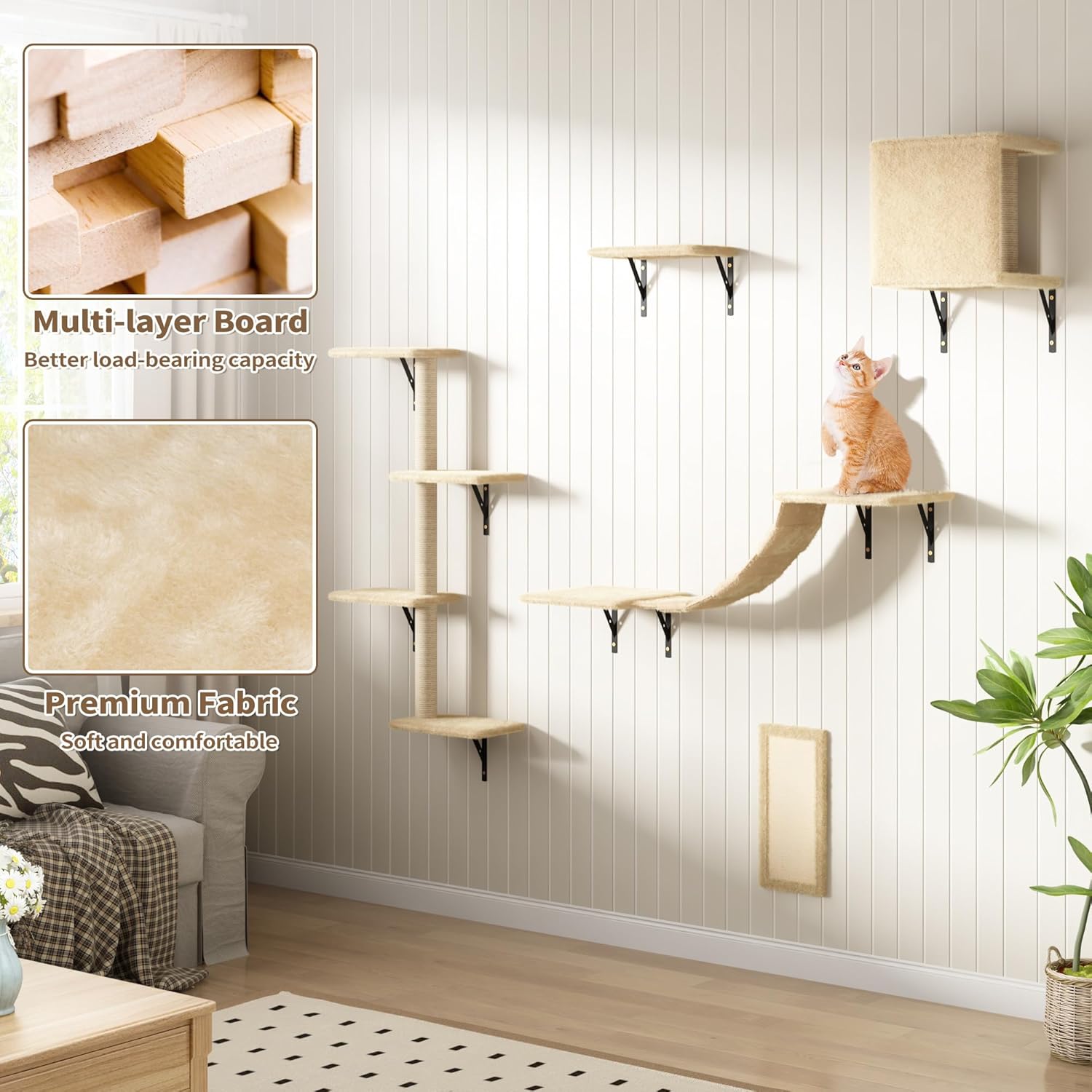 - Safe & Stable Design: Crafted from thick particleboard and supported by triangular metal brackets, each piece holds up to 22 lbs securely. The smooth, burr-free surface and soft plush ensure comfort and safety for both large and small cats