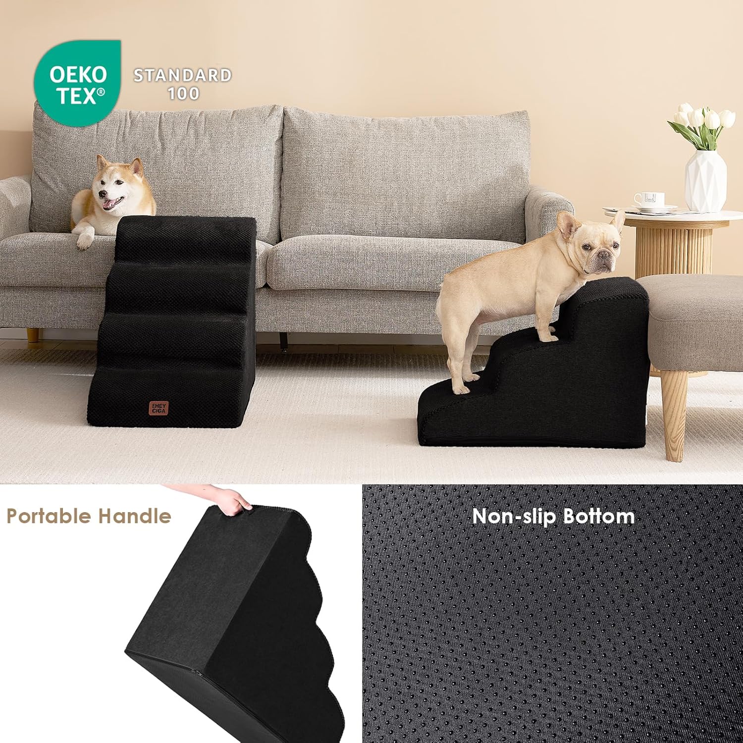 - MULTIPLE STEP SIZES - This dog stair has 2 steps, 3 steps, 4 steps and 5 steps to choose. Our 2-step stairs fits for chair/sofa/bed up to 13inch. 3-step stairs fits for chair/sofa/bed up to 17inch. 4-step stairs fits for chair/sofa/bed up to 21inch. And 5-step stairs fits for chair/sofa/bed up to 24inch.