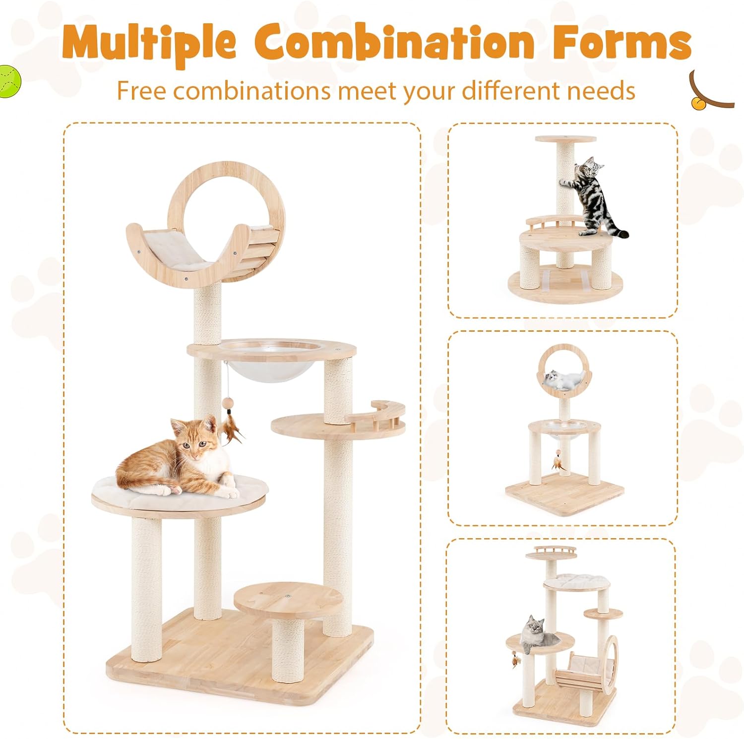 Tangkula Solid Wood Cat Tree, 4-in-1 Building Block Large Cat Tower with Space Capsule Nest, Scratching Posts, Padded Platform, Hanging Toy, Cat Tree Tower with 4 Transformations for Indoor Cats