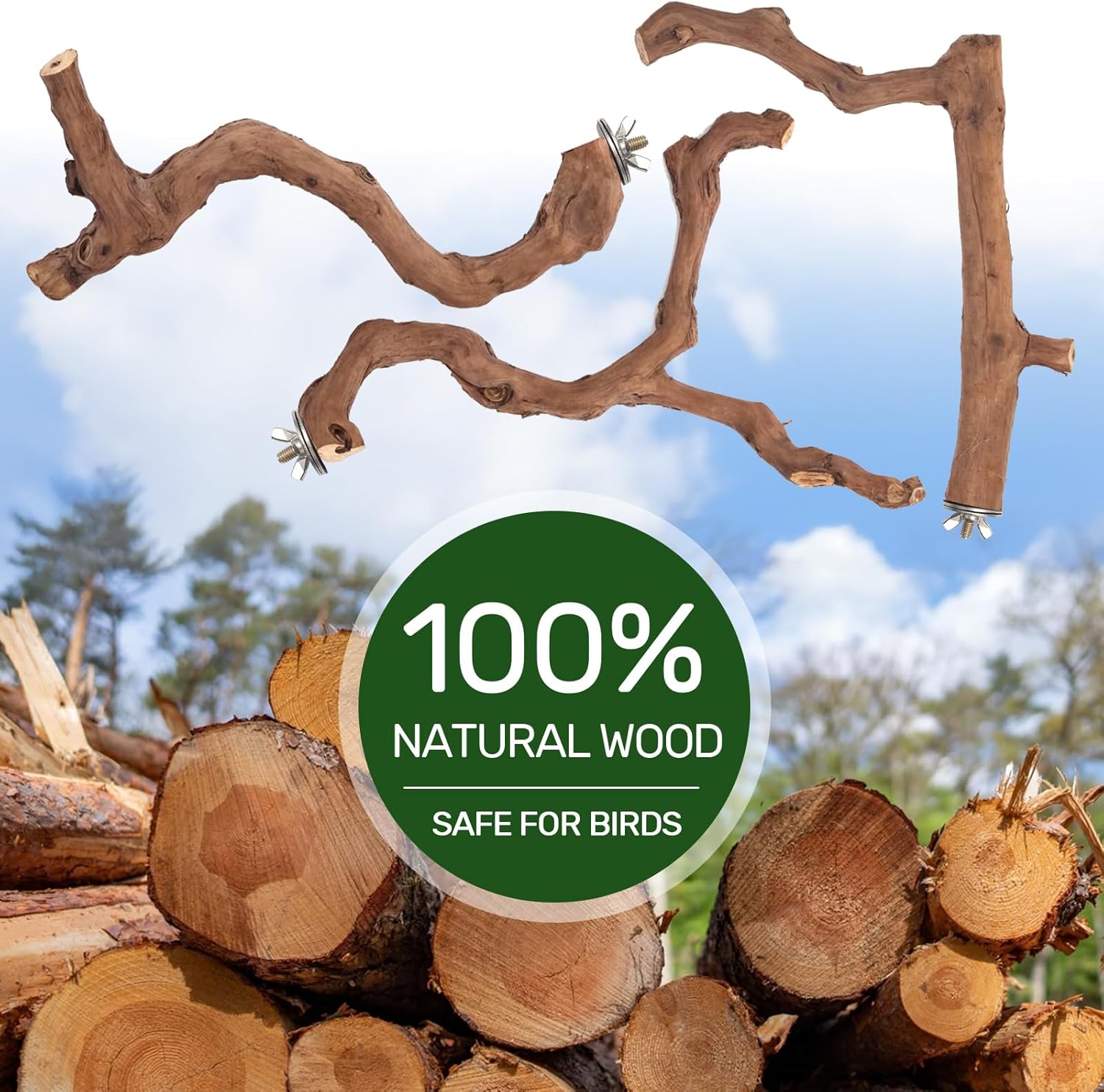 3-Piece Premium Bird Perch Stand with Natural Grape Wood Branch, Paw Grinding Fork, Chewing Stick, Cage Accessories for Parakeets, Budgies, Cockatiels, Finches, Lovebirds