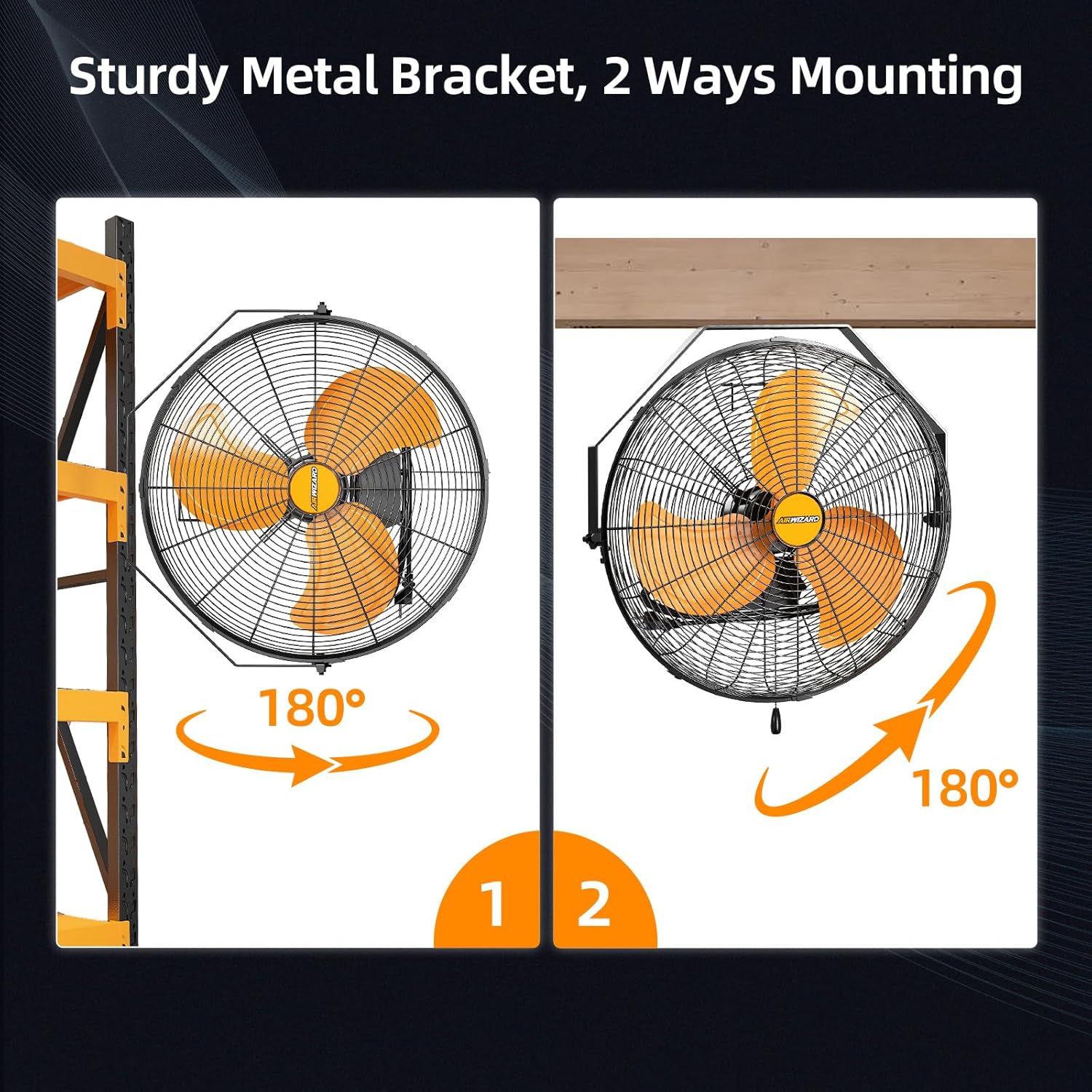 - 2 WAYS MOUNTING - You don't need to assembly the fan, using new bracket made out of power-coated steel construction hang the fan on the wall or the ceiling. This Industrial wall fan can tilt a full 180ยฐ, just switching the adjustment knob to direct air exactly where you need it.