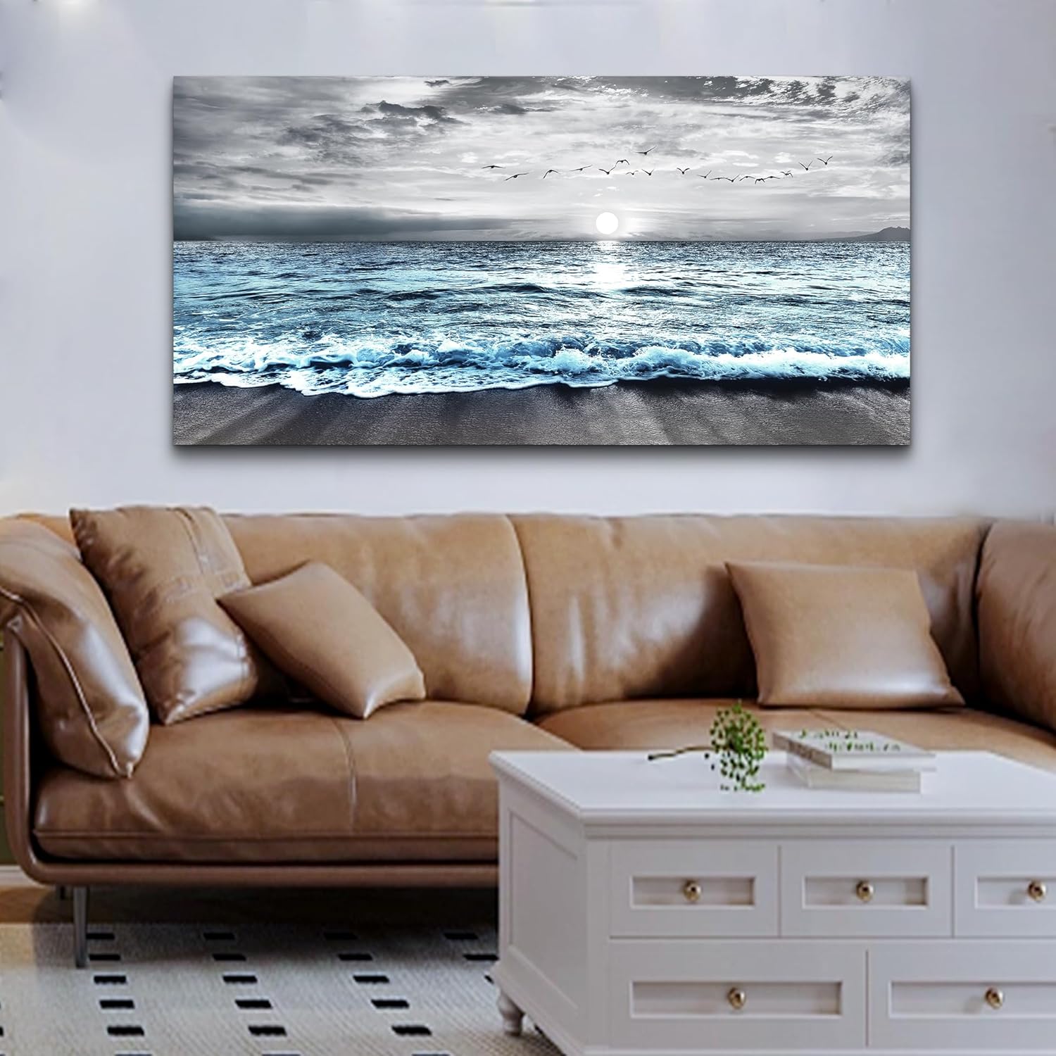 Lapremoly Large Canvas Wall Art For Living Room Wall Decor For Bedroom Office Wall Decorations Black And White Beach Wall Painting Blue Ocean Sea Wave Pictures Stretched and Framed Modern Artwork