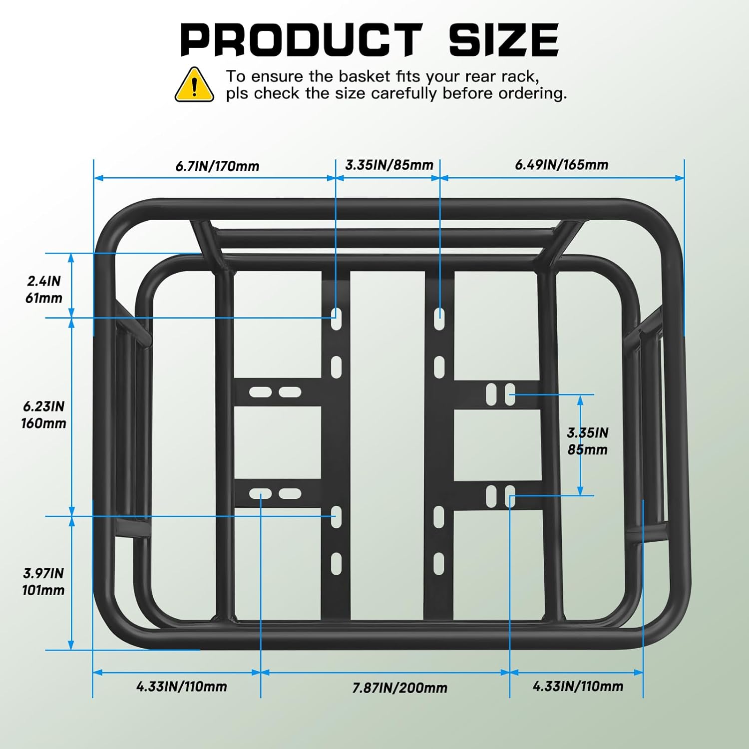 - ๐ฆ๐๐ฝ๐ฒ๐ฟ ๐๐ฎ๐ฟ๐ด๐ฒ ๐ฆ๐ฝ๐ฎ๐ฐ๐ฒ: The dimension of the basket is 16.6 x 12.6 x 6.7 inches, which can support a weight of 100lbs. Perfect for carrying backpacks๏ผpets๏ผdaily shopping, or as a delivery bike basket.