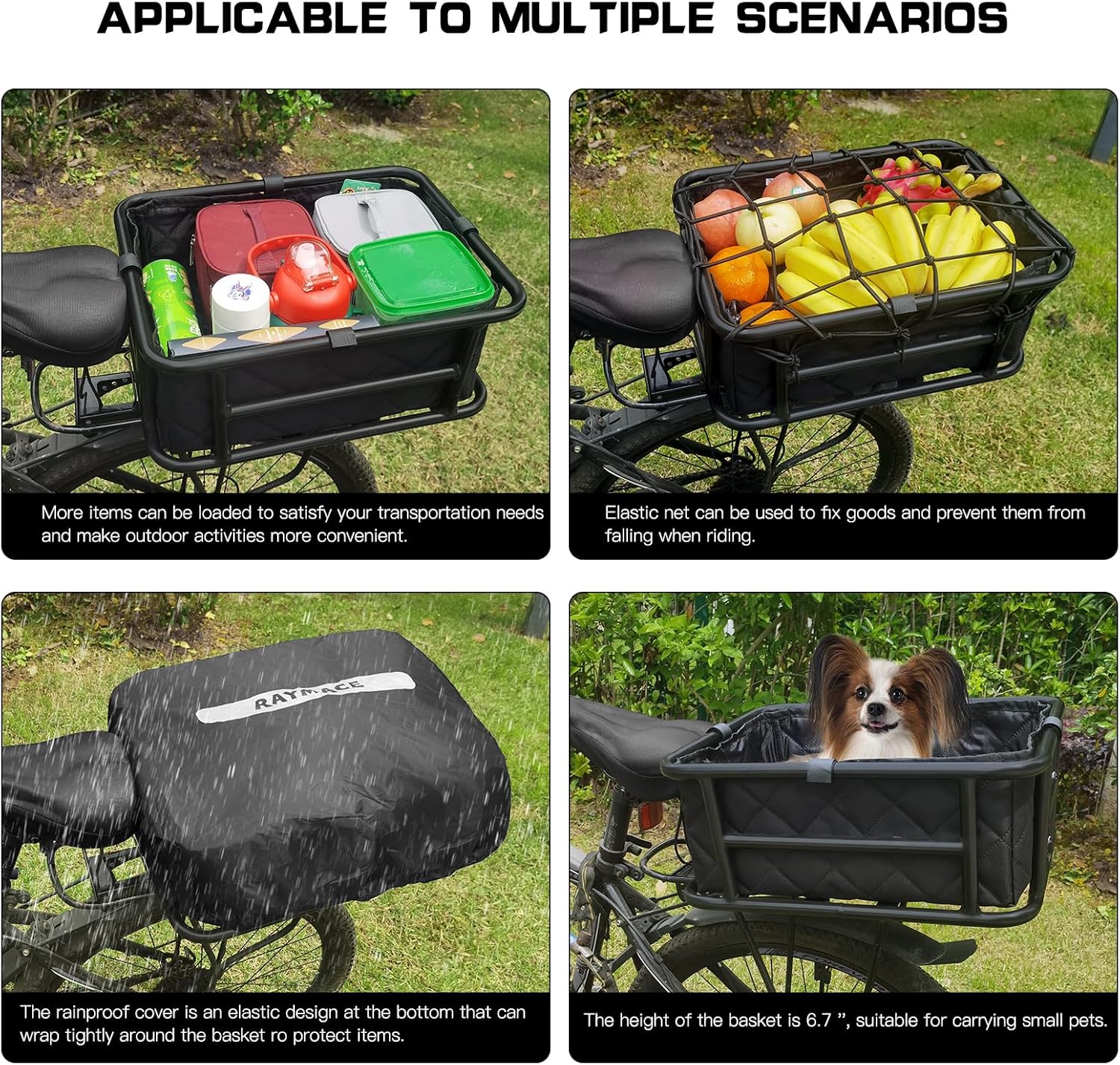 RAYMACE Rear Rack Bike Basket with Cargo Net and Liner Large Bicycle Basket Perfect Mount for Electric Bike