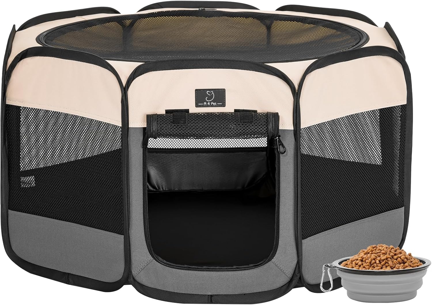 - 【Designed for Pets】A4Pet portable pet playpen is manufactured with high quality oxford cloth, durable steel wires and breathable mesh. It provides a safe interior space for your pets to play and rest, which is ideal for indoor and outdoor use.