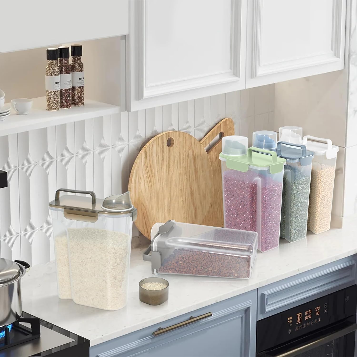 - MULTI-PUrRPOSE STORAGE: Our pet food container is suitable for storing dog food、cat food、bird seed、fish food、rice、 dry food、cereals、oats、flour and other large and small grains, as well as washing powder used at home. It is also a good choice.