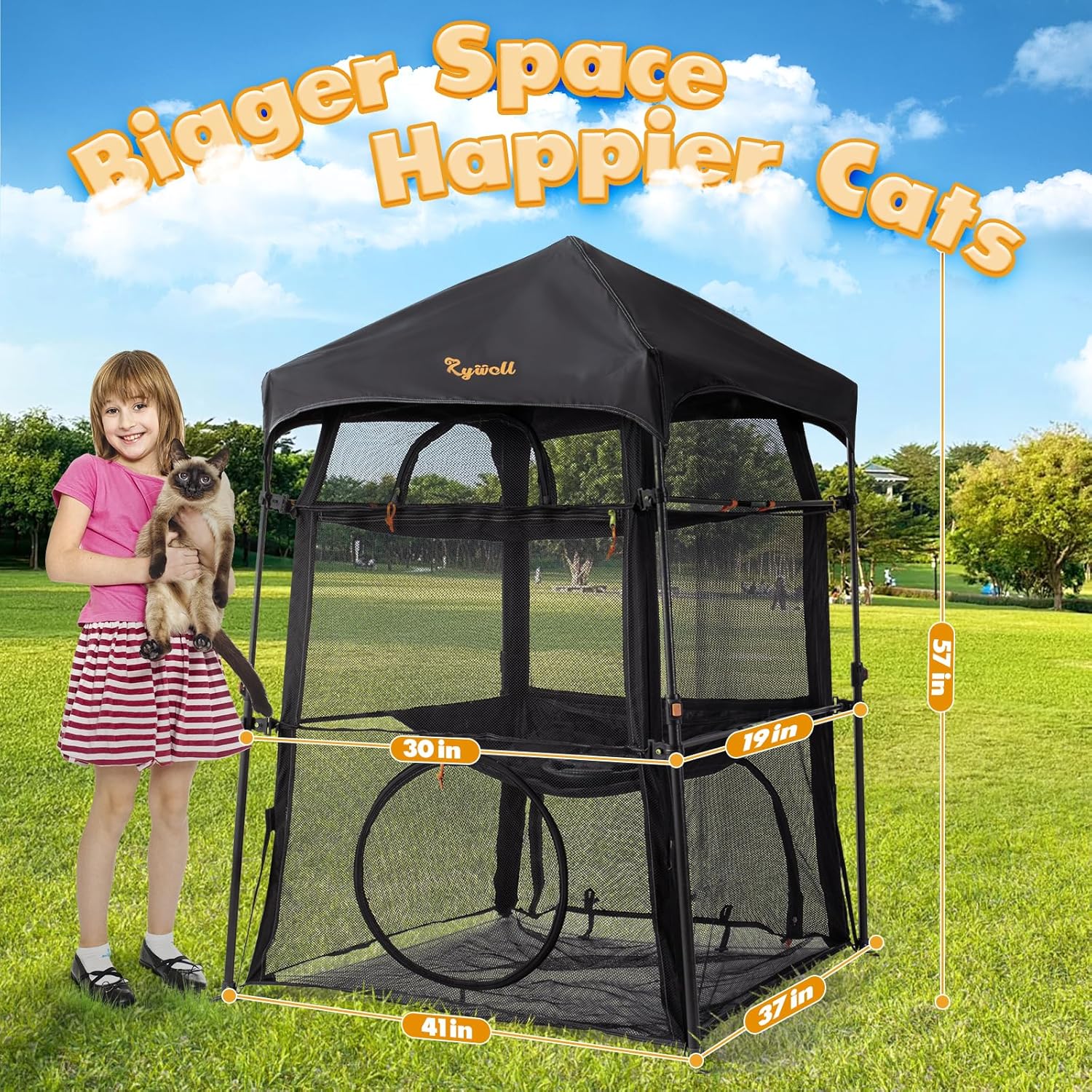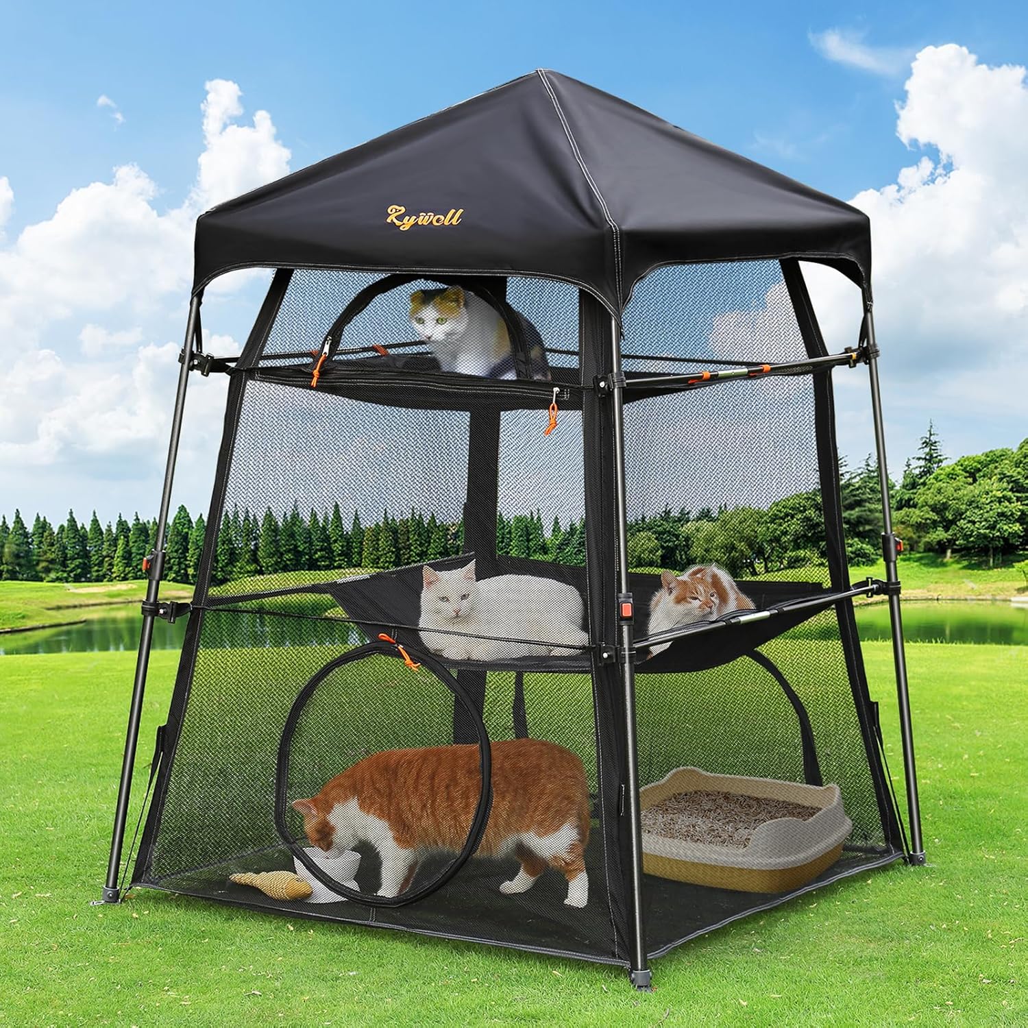 - đ˝ăMore interactive windows for convenienceăThis premium catio cat enclosure contains a fully enclosed indoor space with 5openings and 3levels for cats to snooze and relax. A zip door on the side makes it easy to reach in, whether its meal time or time for some cuddling. The large bottom window makes it easy for the owner to crawl inside to clean and replace cat litter. Rywell cat enclosures can easily be connected with other playsets via tunnels, Free to customize your feline's playground!