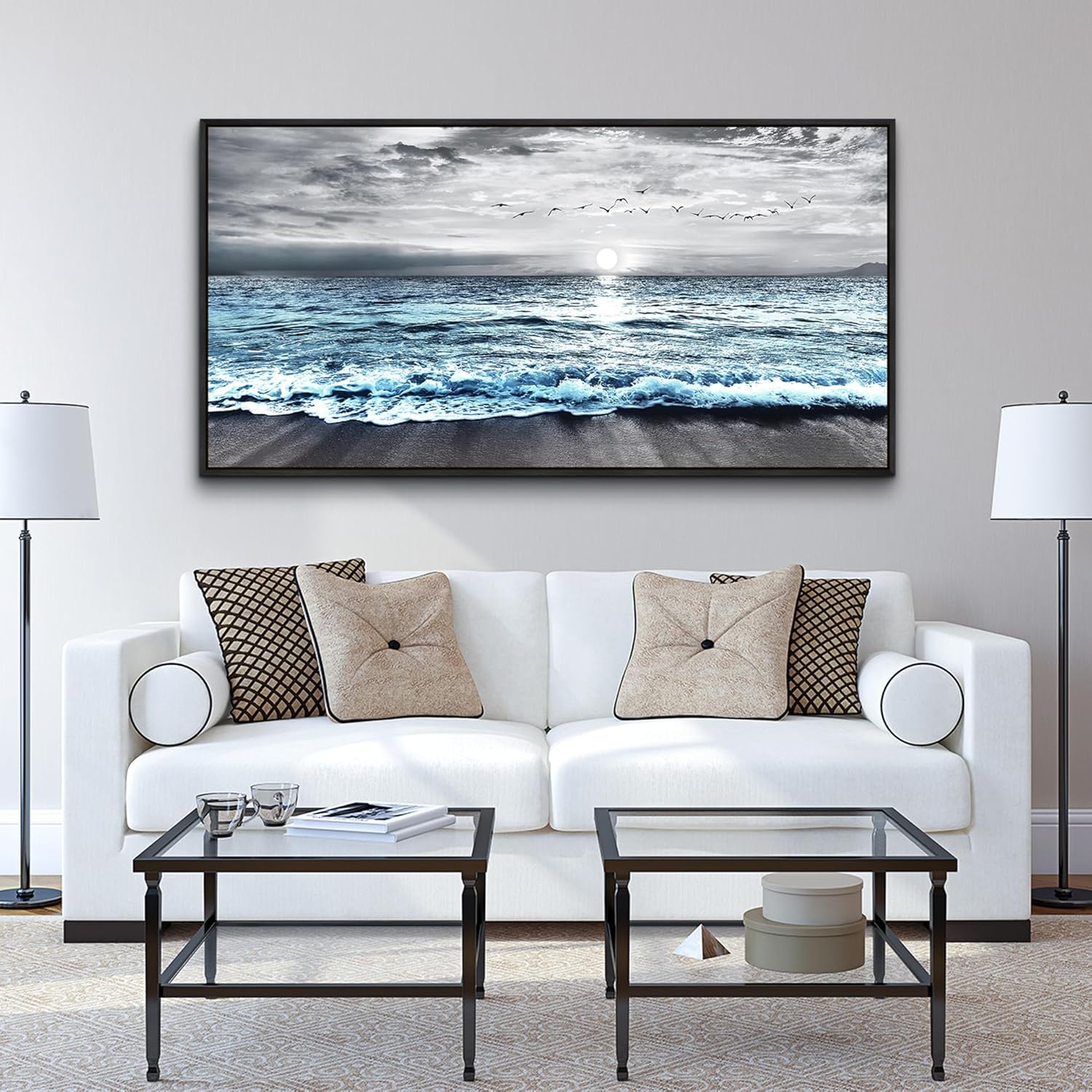 Wapluam Large Wall Art For Living Room Wall Decor For Bedroom Office Wall Decorations Black And White Wall Painting Blue Sea Wave Pictures Artwork For Modern Black Framed Beach Canvas Prints Poster