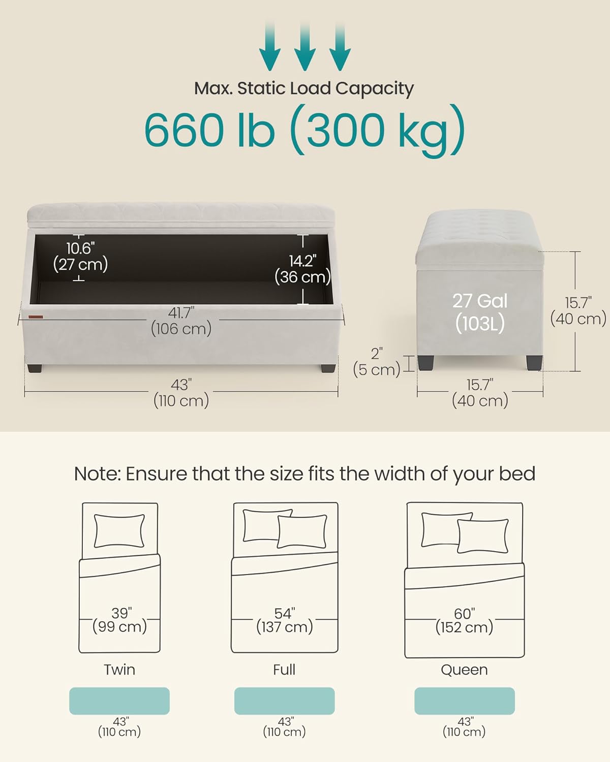 - ăSPACIOUS STORAGEăSized at 15.7"D x 43"W x 15.7"H (40 x 110 x 40 cm), this bench offers a 27-gallon (103 L) volume for your blankets, books, and bed sheets