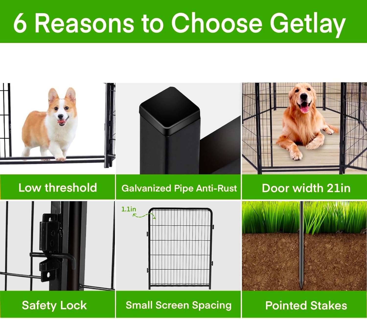 - Advantage 2: Getlay's Garden Dog Fences is Designed as a 21-inch-wide Gate with No Threshold, and Anyone or Animals Can Enter and Exit Freely. Unlike other Fences with High Thresholds and Narrow Gates and Tripping. Super Easy to Assemble it Won’t Take You More Than 10 Minutes to Assemble These Portable Dog Fences , Panels Can be Added or Removed Freely to Give You a Fully Flexible Area and Arrange the Dog Pen in any Shape You Need