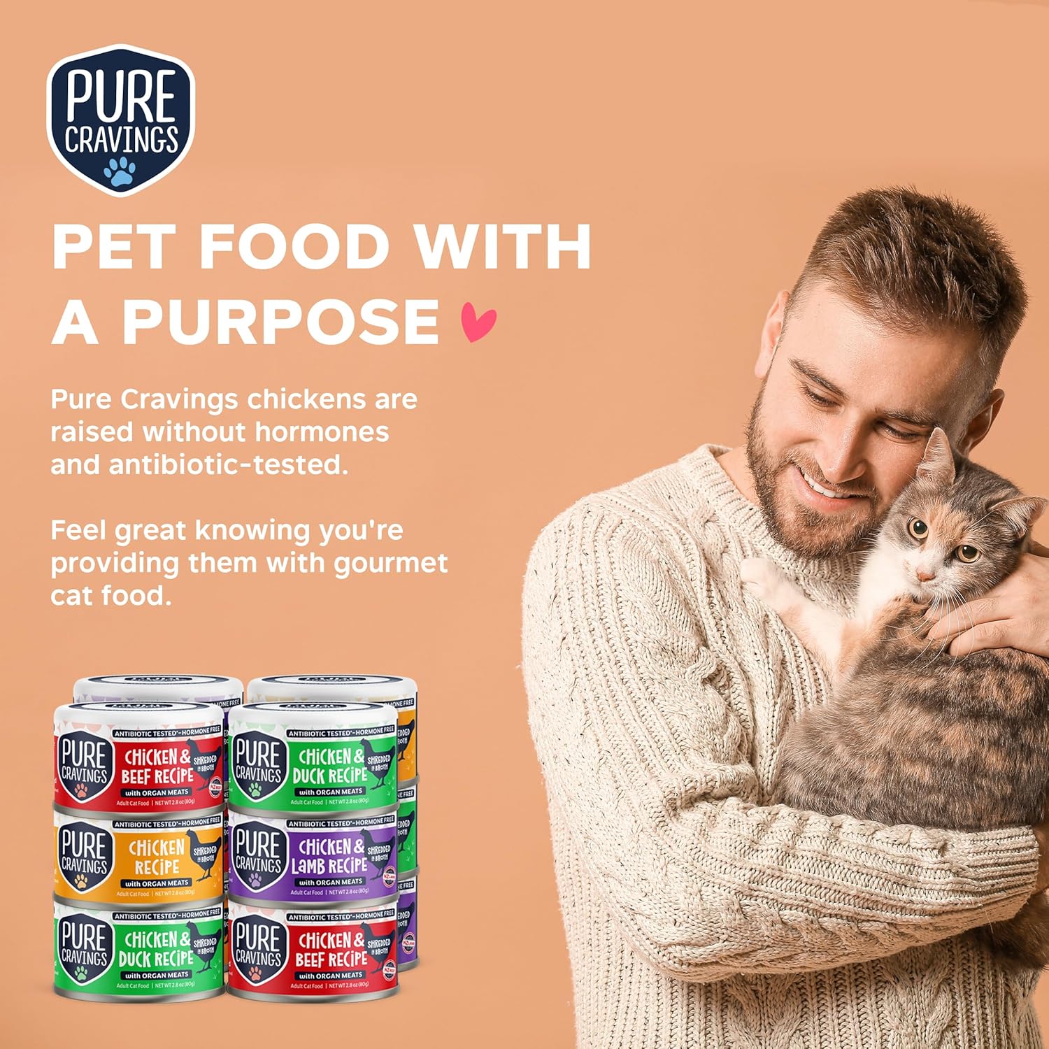 - GOURMET FOOD FOR CATS β Treat your furry companion to the finest dining experience with our premium Shredded Chicken with Organ Meats in Broth, featuring a variety of tantalizing recipes including topped with Chicken, Duck, Beef, or Lamb.