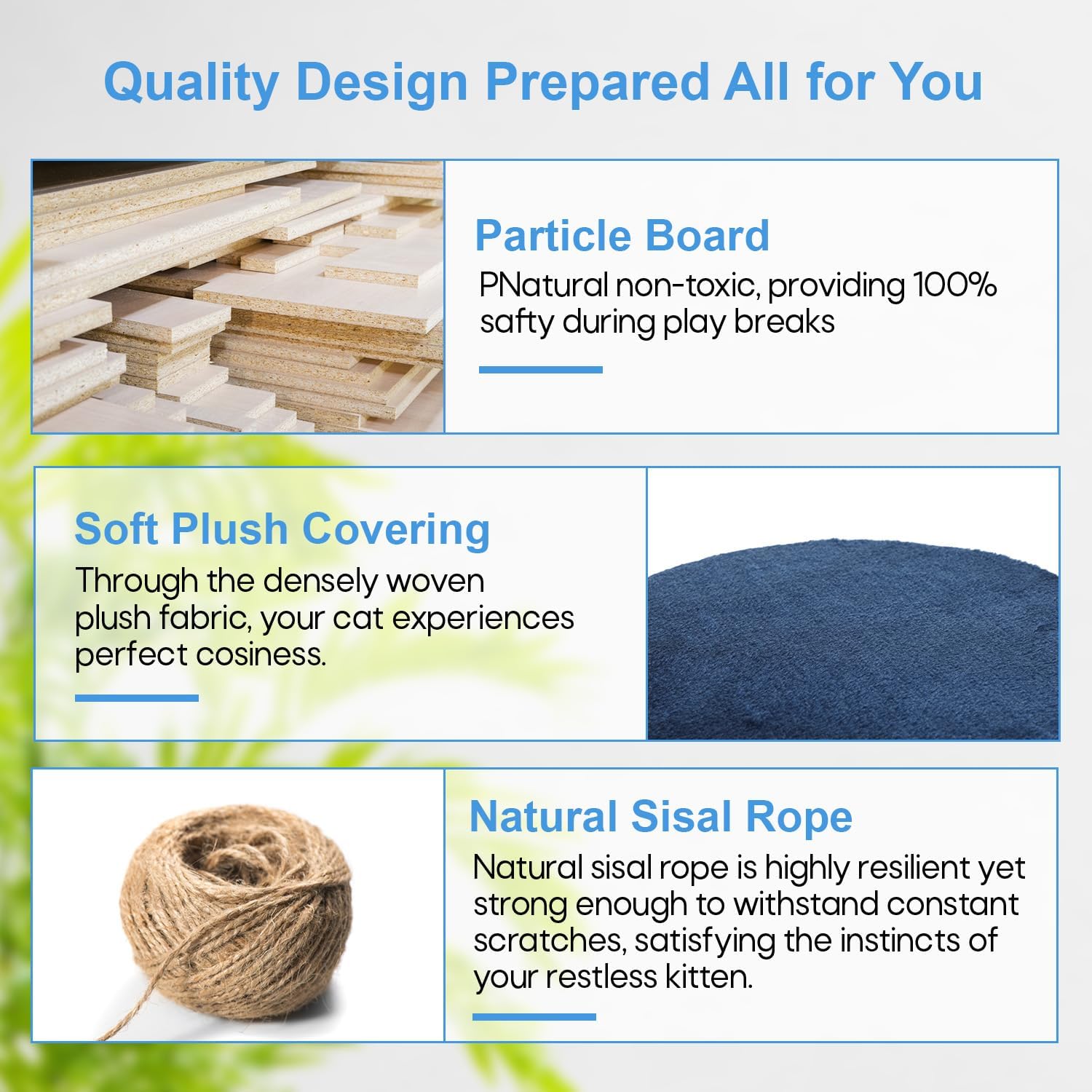 - 🐱 【Posts for Scratching Covered in Sisal 】These are scratching surfaces that are integrated into the framework. Cats love to bury their claws in sisal because it's a sturdy substance with a coarse texture. Our cat tree promotes healthy scratching habits and helps discourage cats from damaging furniture by offering dedicated spaces for them to scratch.