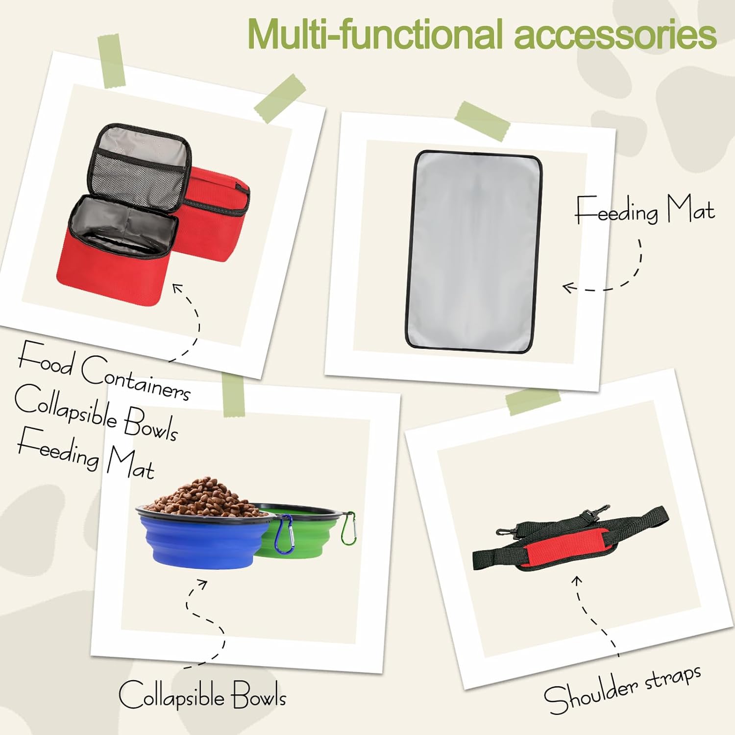- 【Travel Bag For Dog Kit Include】: 1 Dog Tote bag, 2 Dog Food carriers bag, 1 Water-Resistant Placemat, 2 Pet Silicone collapsible bowls (The colors of the bowl are randomly matched). This dog travel tote bag is the ultimate food storage and supply gear for any trip.