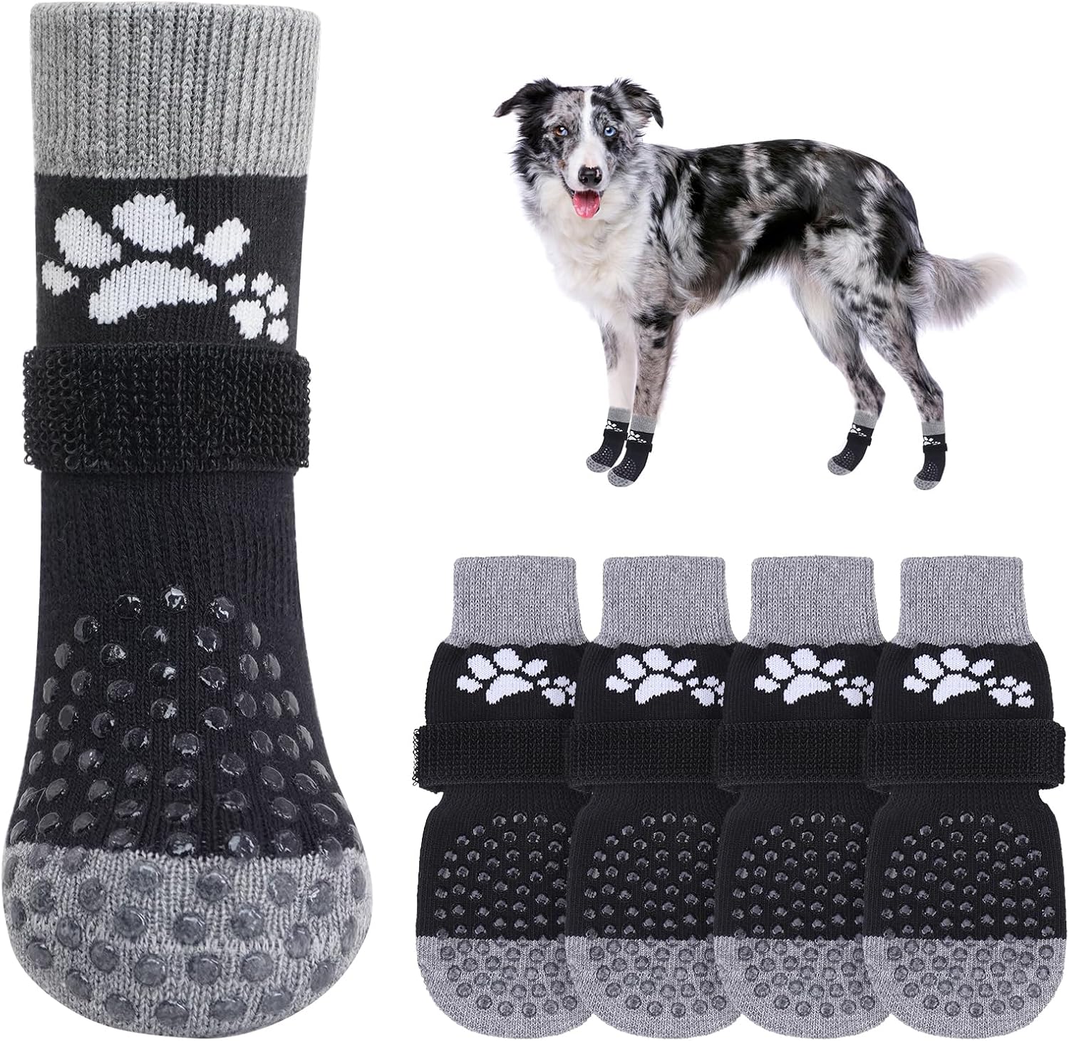- COMFORTABLE AND BREATHABLE CUTE DOG SOCKS: Made of soft and elastic fabric, perfect fit for your dog's feet, breathable and not stuffy, and thicker than general dog grip socks, more wear-resistant. White double paw jacquard design at the top center of the front and back, cute and fashionable.