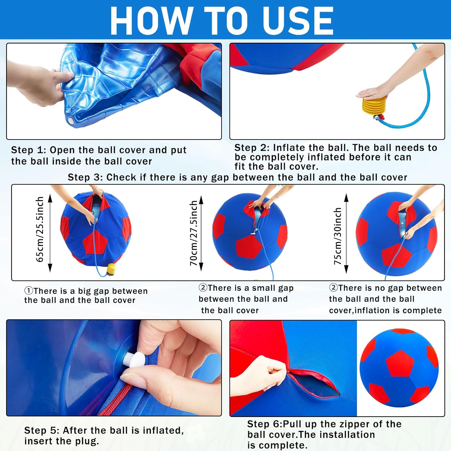- Large Enough Size: when the horses toy is inflated to less than 30 inches, it cannot fit into the ball cover; Please continue to inflate it without worrying about the ball bursting; When it is inflated to 30 inches, it can fit into the ball cover completely without any gaps