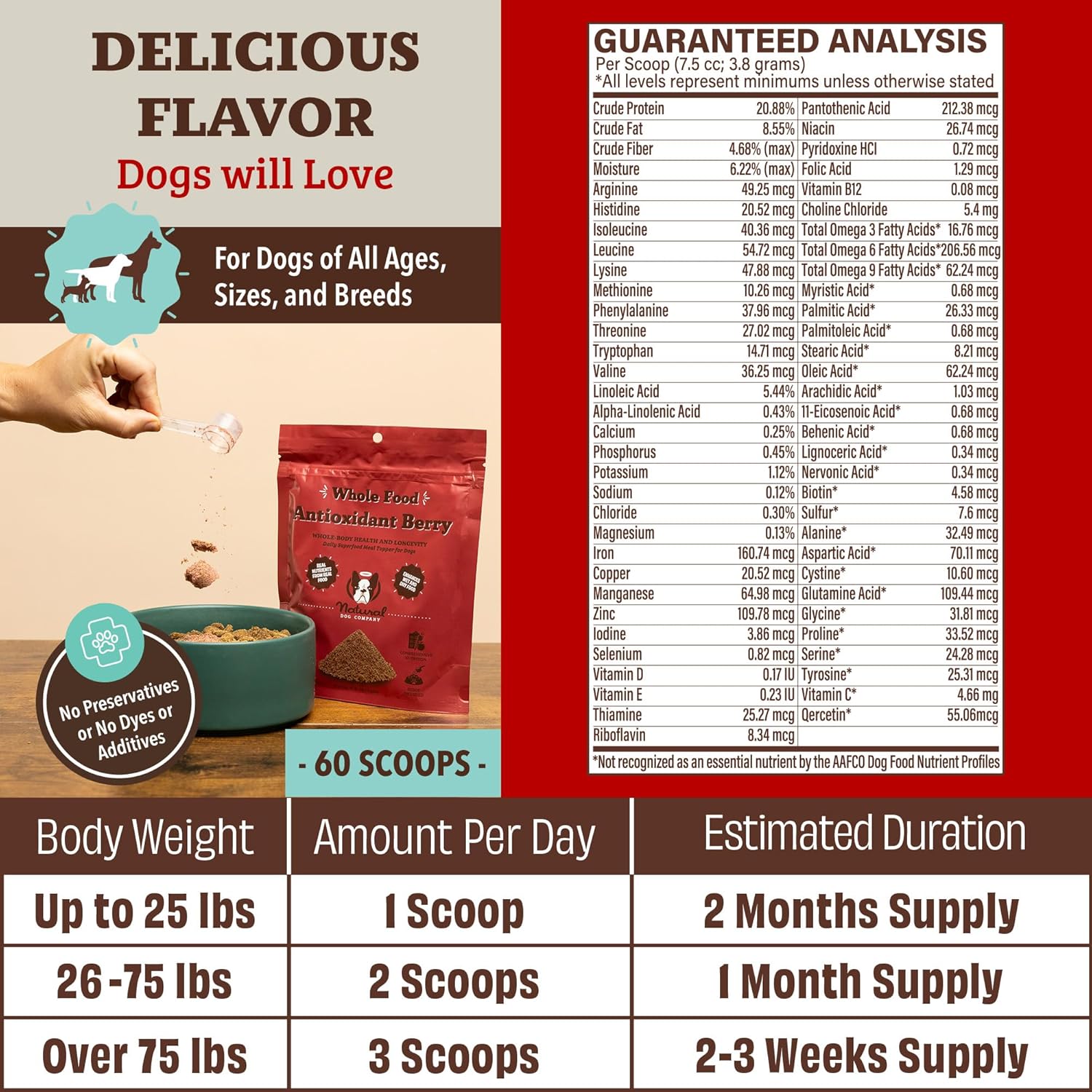 - EASY TO USE FOR DAILY NUTRITION: Our Antioxidant Berry Granules are simple to incorporate into your dog’s diet. Just sprinkle the recommended amount over their wet or dry food at each meal. Just sprinkle 1 scoop daily for dogs under 25 lbs, 2 scoops for dogs between 25 and 75 lbs, and 3 scoops for dogs over 75 lbs over their wet or dry food.