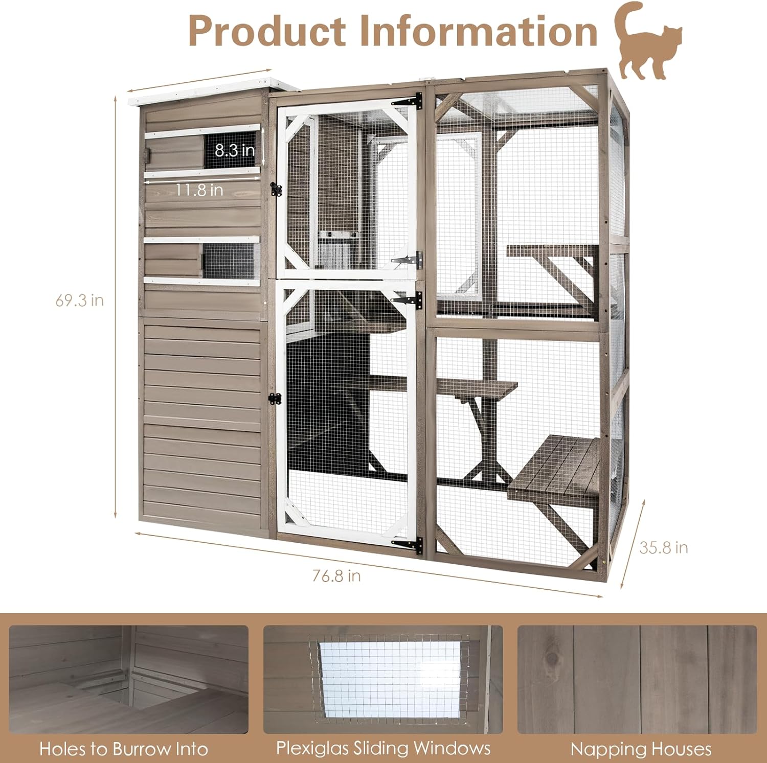 - 【Large Cat House】The outdoor cat enclosures is spacious enough and high enough at a height of 69.3" with 4 safety latchs for adults to get in and out or interact with it, as well as easy to clean.