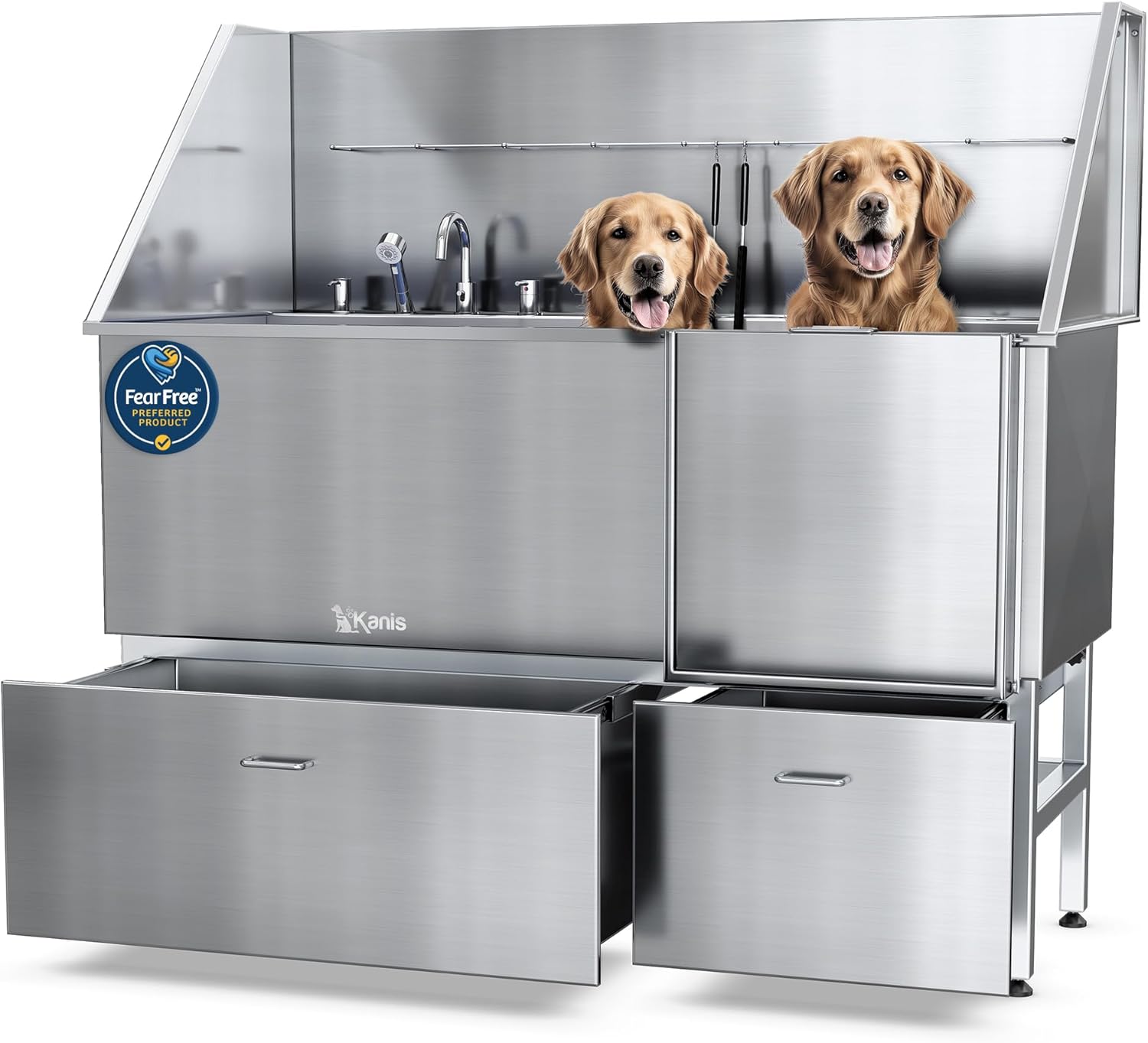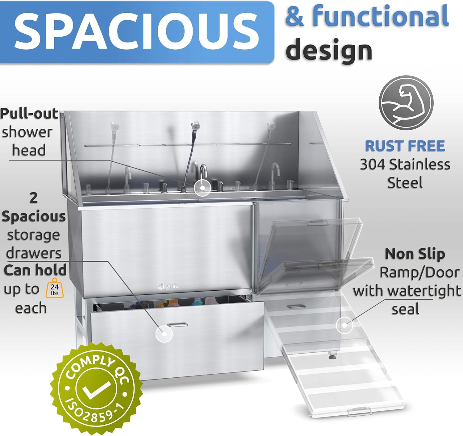KANIS Professional Dog Washing Station - 304 Stainless Steel Pet Wash Sink & Grooming Bath Tub for Home with Ramp, Shower, Floor Grate, Storage Drawers, and Faucet for Large, Medium & Small Pets