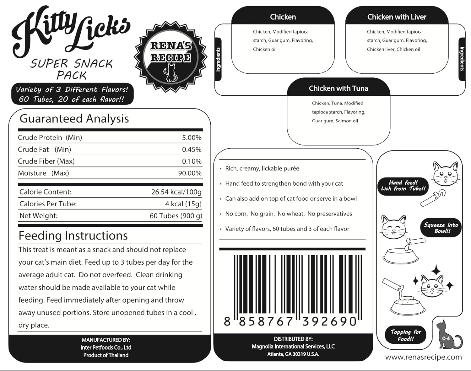 Rena's Recipe Kitty Licks Chicken Barrel (60 Tubes) 3 flavorsX 20 Tubes Cream Lickable Cat Treats 3 Different Flavors: Chicken, Chicken with Tuna, and Chicken with Liver