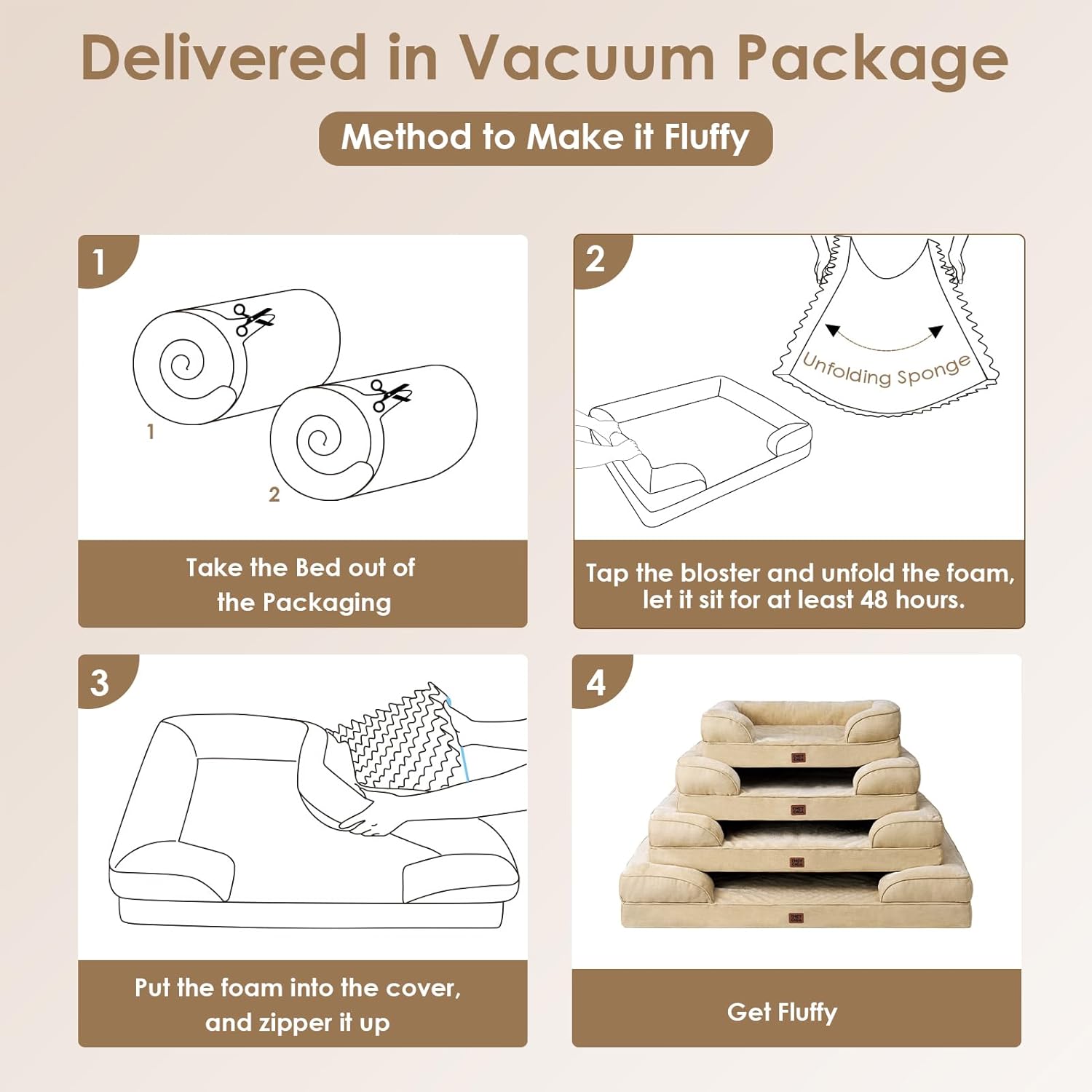 - CARE INSTRUCTIONS: Our dog bed features a removable and washable cover with a zipper closure, making it easy to clean. Remove the foam insert, and the cover can be washed in a machine. Please note that the foam insert is not washable. Allow the bed to expand for 24-48 hours after unpacking.