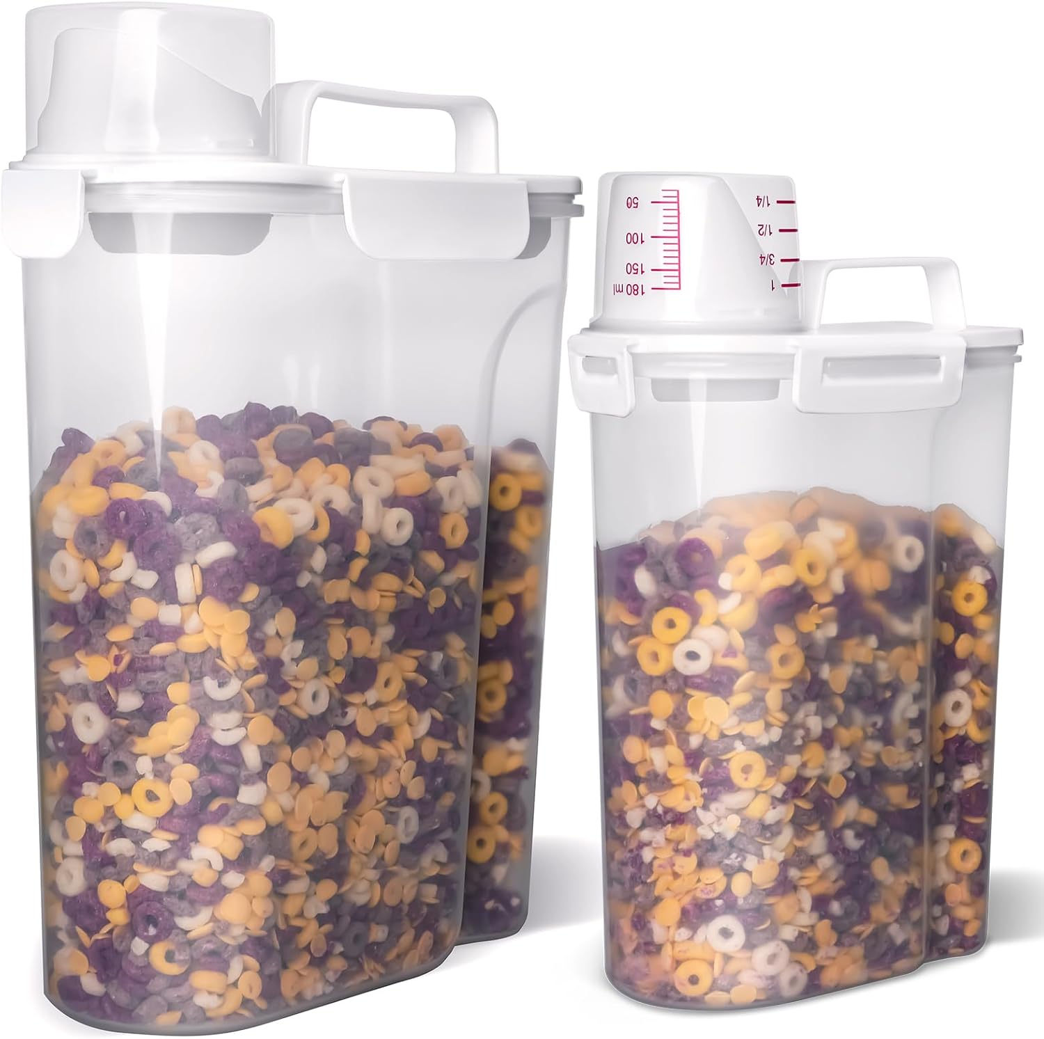 - CLEAR and AIRTIGHT CONTAINERS: it's a really clear plastic container. You can identify the contents without opening them. 4-sided locking lid with silicone seal.It seals really well so you don't need to worry that your cereal goes stales. Measuring cup can screw on over the pour spout. It also can keep out of mice, rats, insects and other pests away