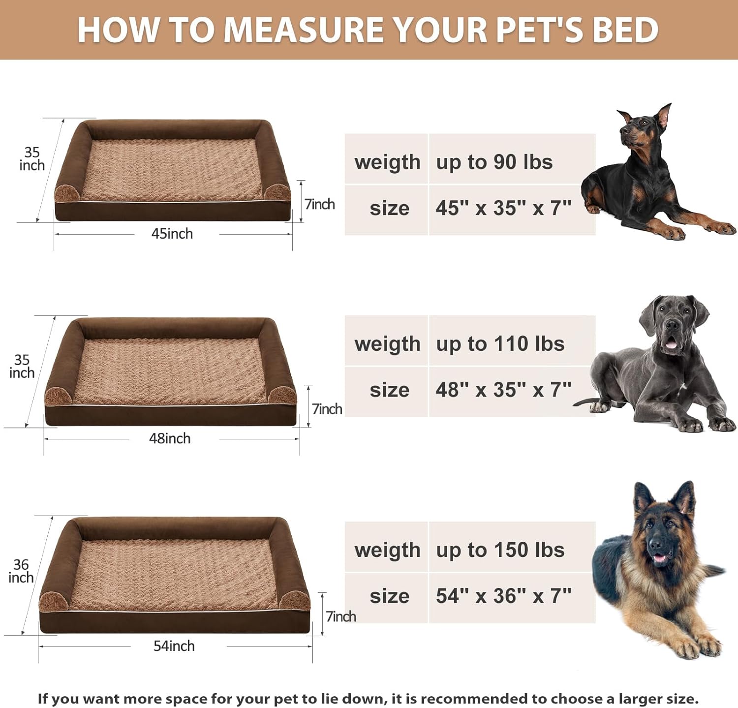 - DIMENSIONS (DOG BEDS FOR MEDIUM DOGS): jumber plus dog bed 48" x 35" x 7" (3.5" bolstered side ) for medium and large dogs up to 110 lbs. For dogs that like to roll around, sizing up will be more comfortable.