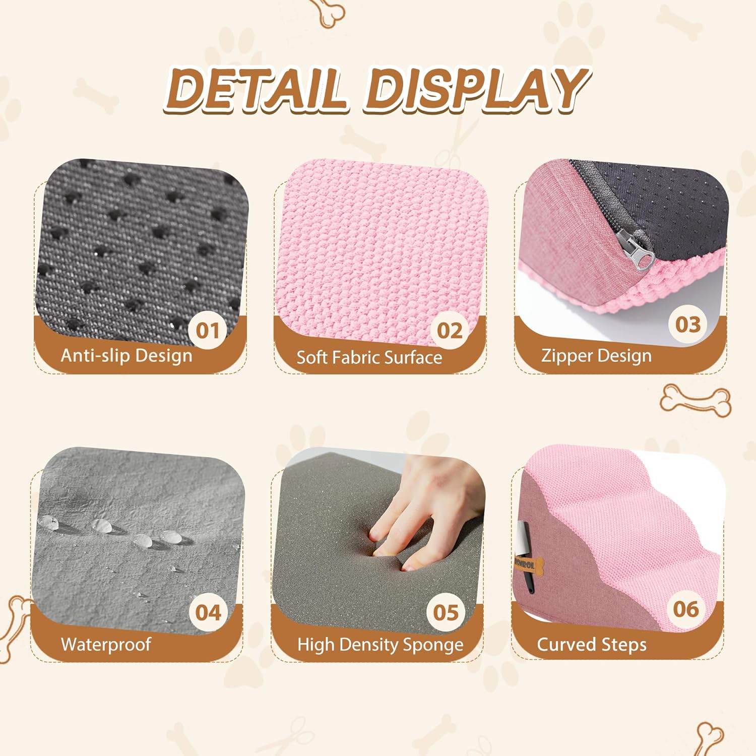 Romrol Dog Stairs Ramp for High Beds Couches, High Density Foam Pet Steps with Durable Non-Slip Waterproof Fabric Cover, Dog Stairs for Small Dogs or Cats or Pets, 3-Step,15 Inch,Pink